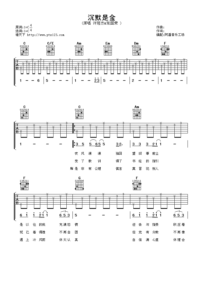 曲谱介绍: 张国荣《沉默是金》吉他弹唱谱,采用C调指法编配,阿潘音乐工场编配出品,共有4张高清图谱。
