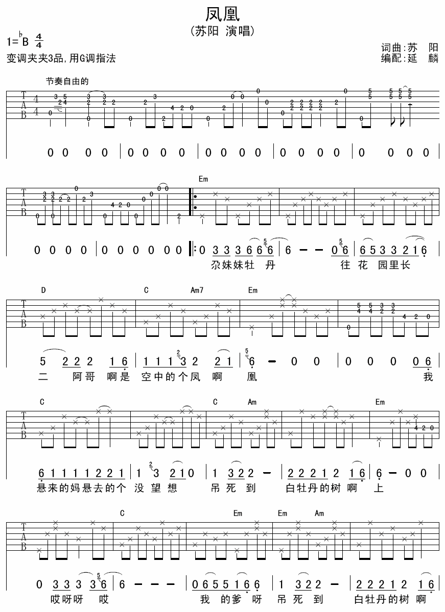 曲谱介绍: 苏阳《凤凰》吉他弹唱谱,采用B调指法编配,延麟编配出品,共有2张高清图谱,免翻页排版设计。