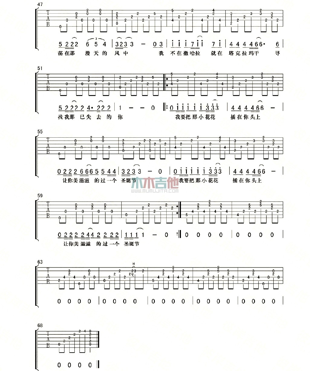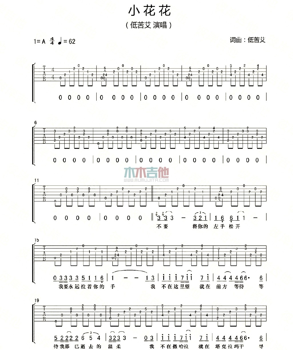 曲谱介绍: 低苦艾乐队《小花花》吉他弹唱谱,采用A调指法编配,木木吉他编配出品,共有3张高清图谱。