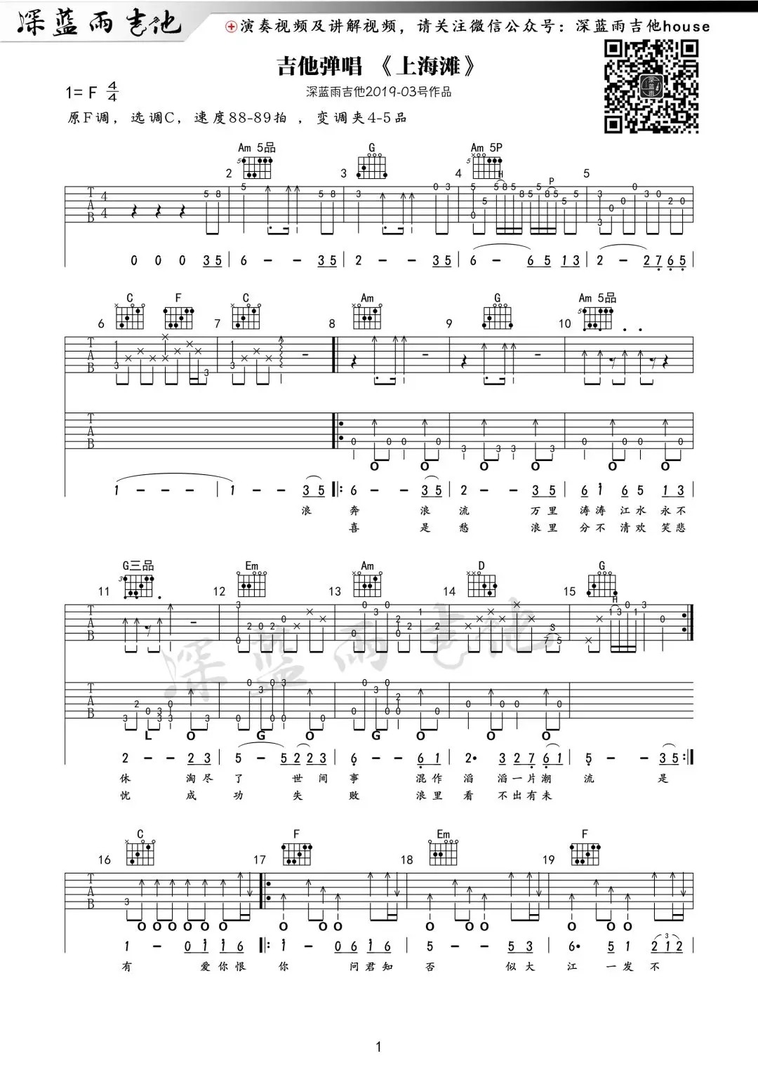 曲谱介绍: 叶丽仪《上海滩》吉他弹唱谱,采用F调指法编配,深蓝雨吉他编配出品,共有2张高清图谱,免翻页排版设计。