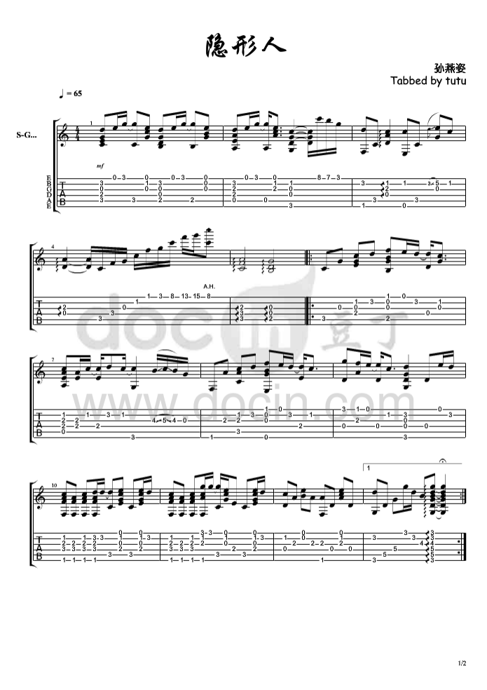 曲谱介绍: 孙燕姿《隐形人》吉他独奏谱,豆丁网编配出品,共有2张高清图谱,免翻页排版设计。