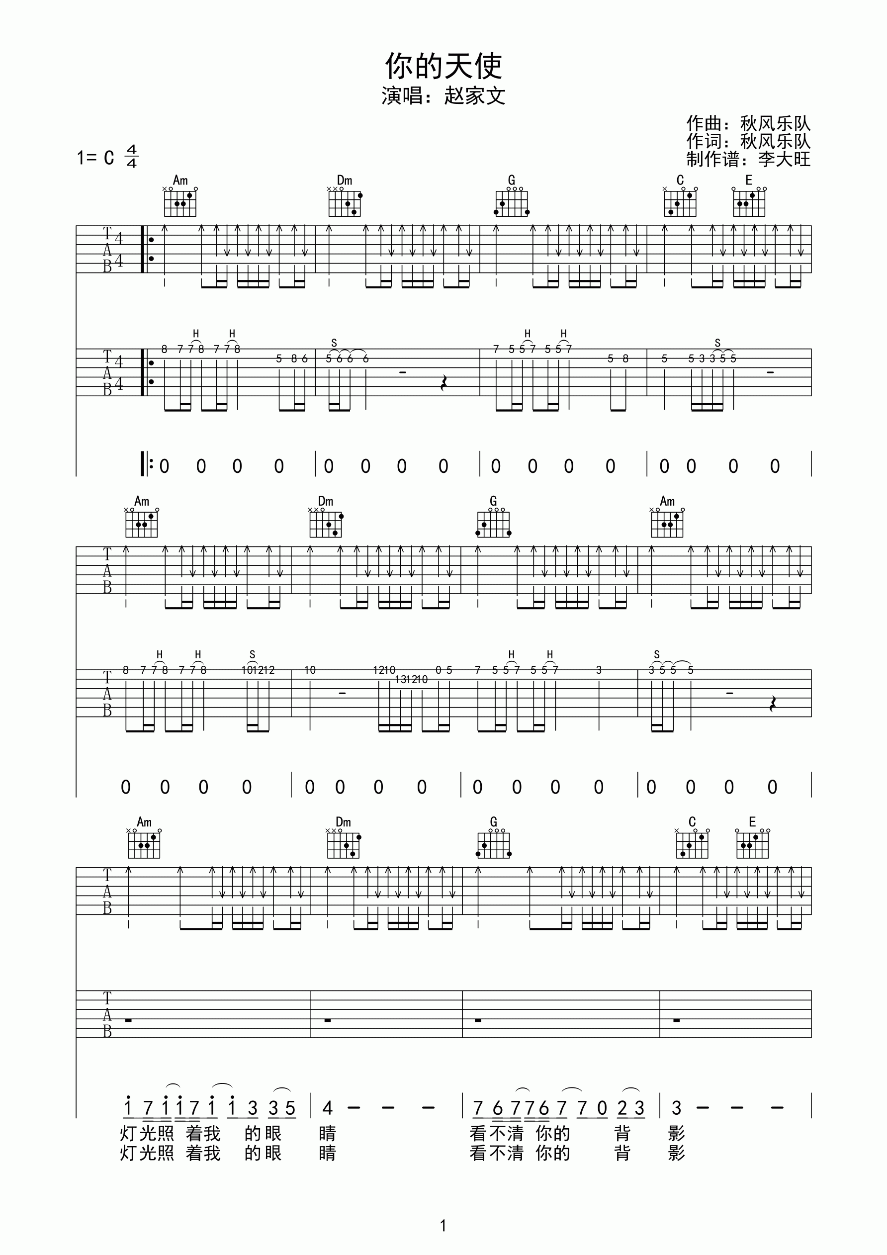 曲谱介绍: 赵家文《你的天使》吉他弹唱谱,采用C调指法编配,李大旺编配出品,共有4张高清图谱。