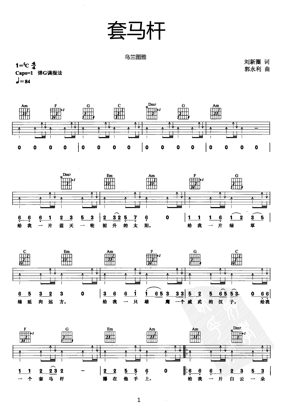 曲谱介绍: 乌兰图雅《套马杆》吉他弹唱谱,采用C调指法编配,吉他吧编配出品,共有3张高清图谱。