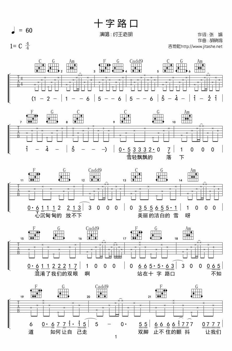 曲谱介绍: 纣王老胡《十字路口》吉他弹唱谱,采用C调指法编配,吉他社编配出品,共有3张高清图谱。