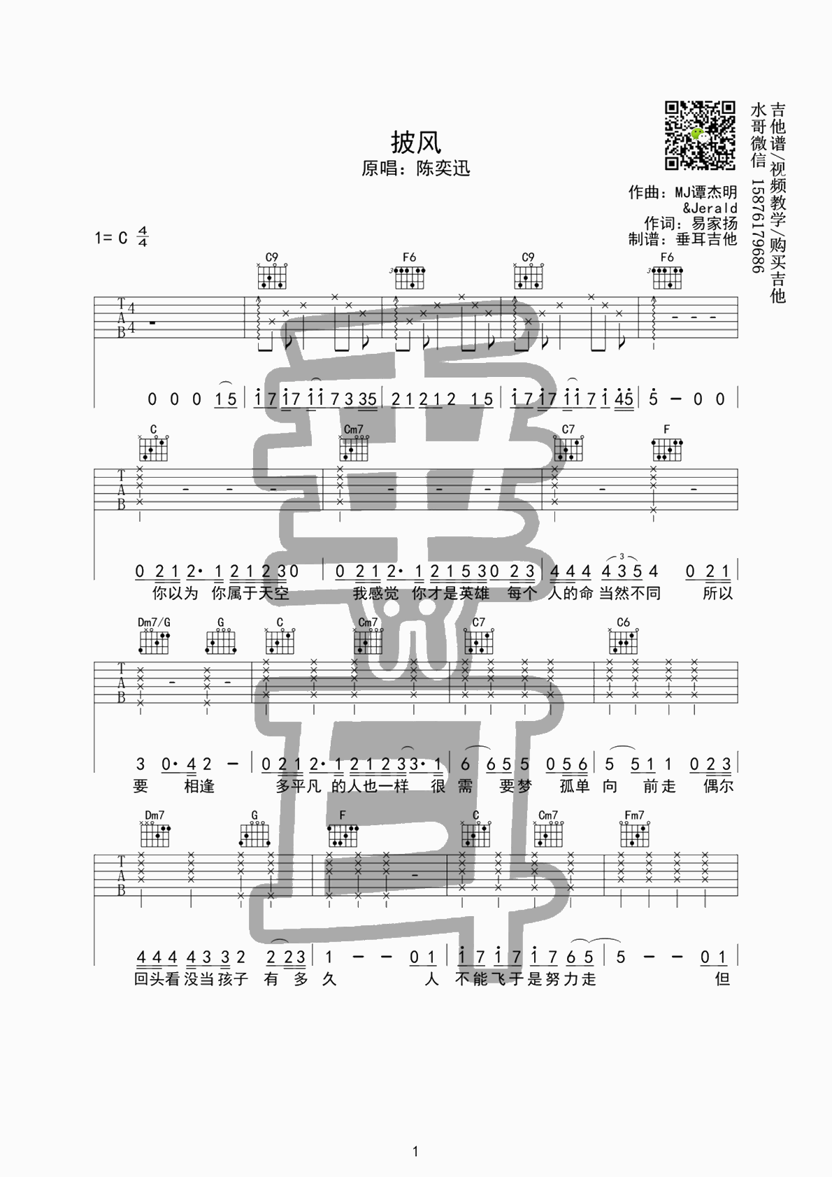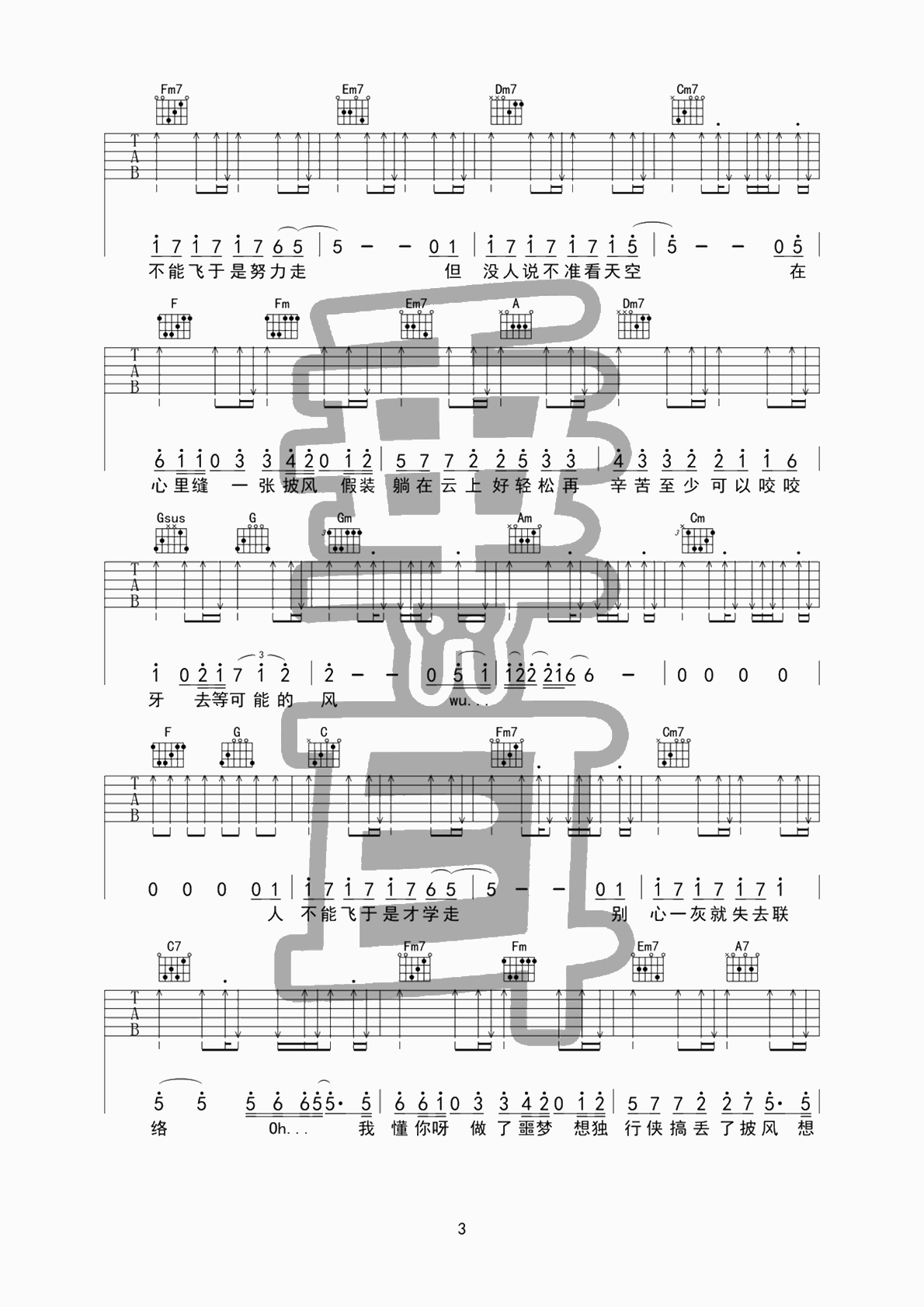 曲谱介绍: 陈奕迅《披风》吉他弹唱谱,采用C调指法编配,垂耳吉他编配出品,共有4张高清图谱。