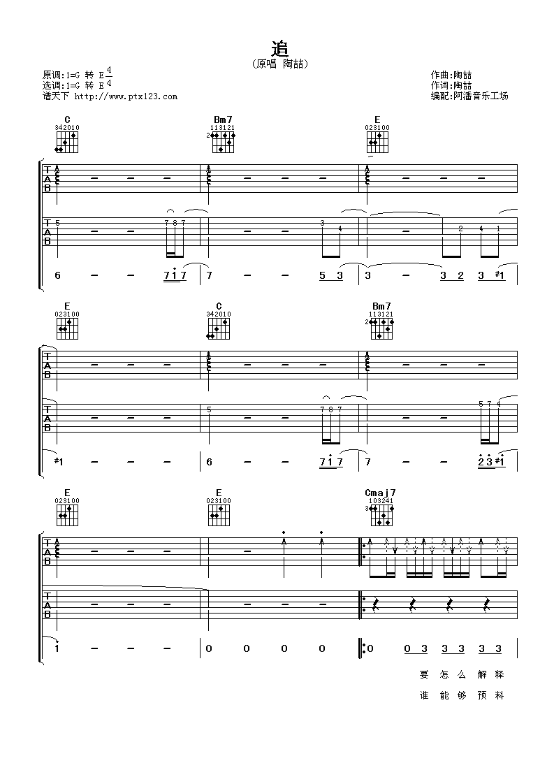 曲谱介绍: 陶喆《追》吉他弹唱谱,采用G调指法编配,阿潘音乐工场编配出品,共有4张高清图谱。