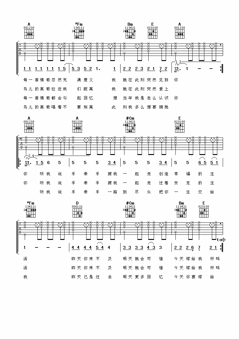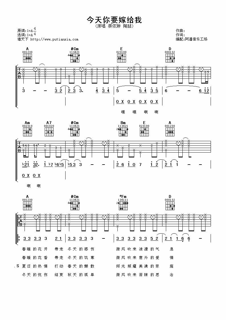 曲谱介绍: 蔡依林《今天你要嫁给我》吉他弹唱谱,采用A调指法编配,阿潘音乐工场编配出品,共有5张高清图谱。