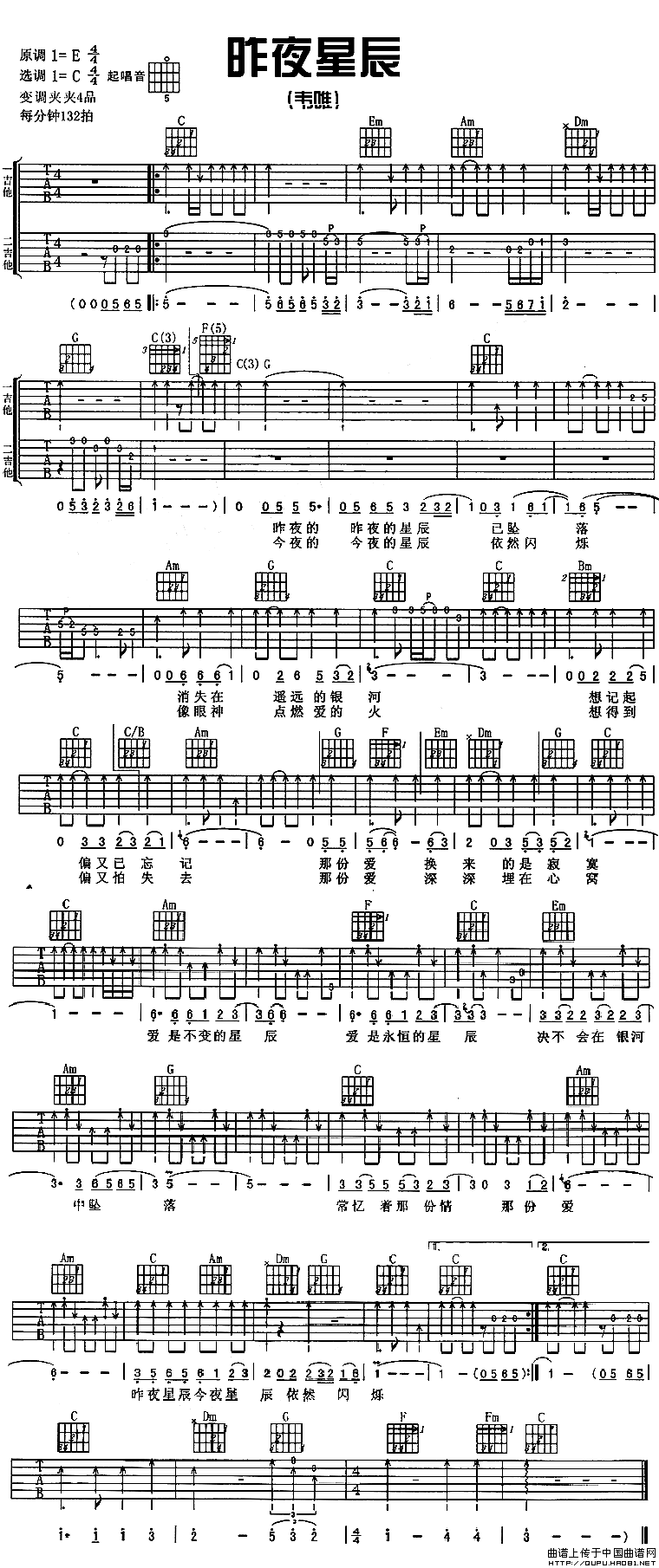 曲谱介绍: 韦唯《昨夜星辰》吉他弹唱谱,采用C调指法编配,中国曲谱网编配出品,共有1张高清图谱,免翻页排版设计。