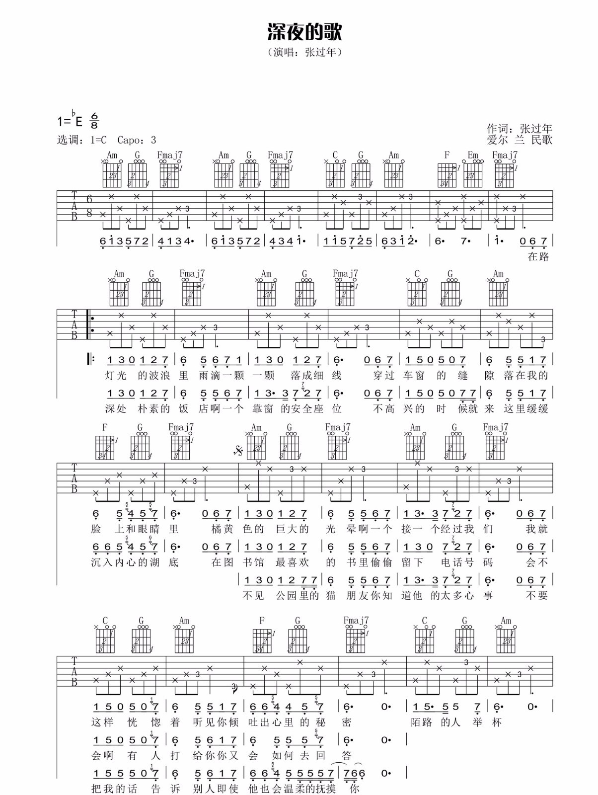 曲谱介绍: 张过年《深夜的歌》吉他弹唱谱,采用C调指法编配,共有2张高清图谱,免翻页排版设计。