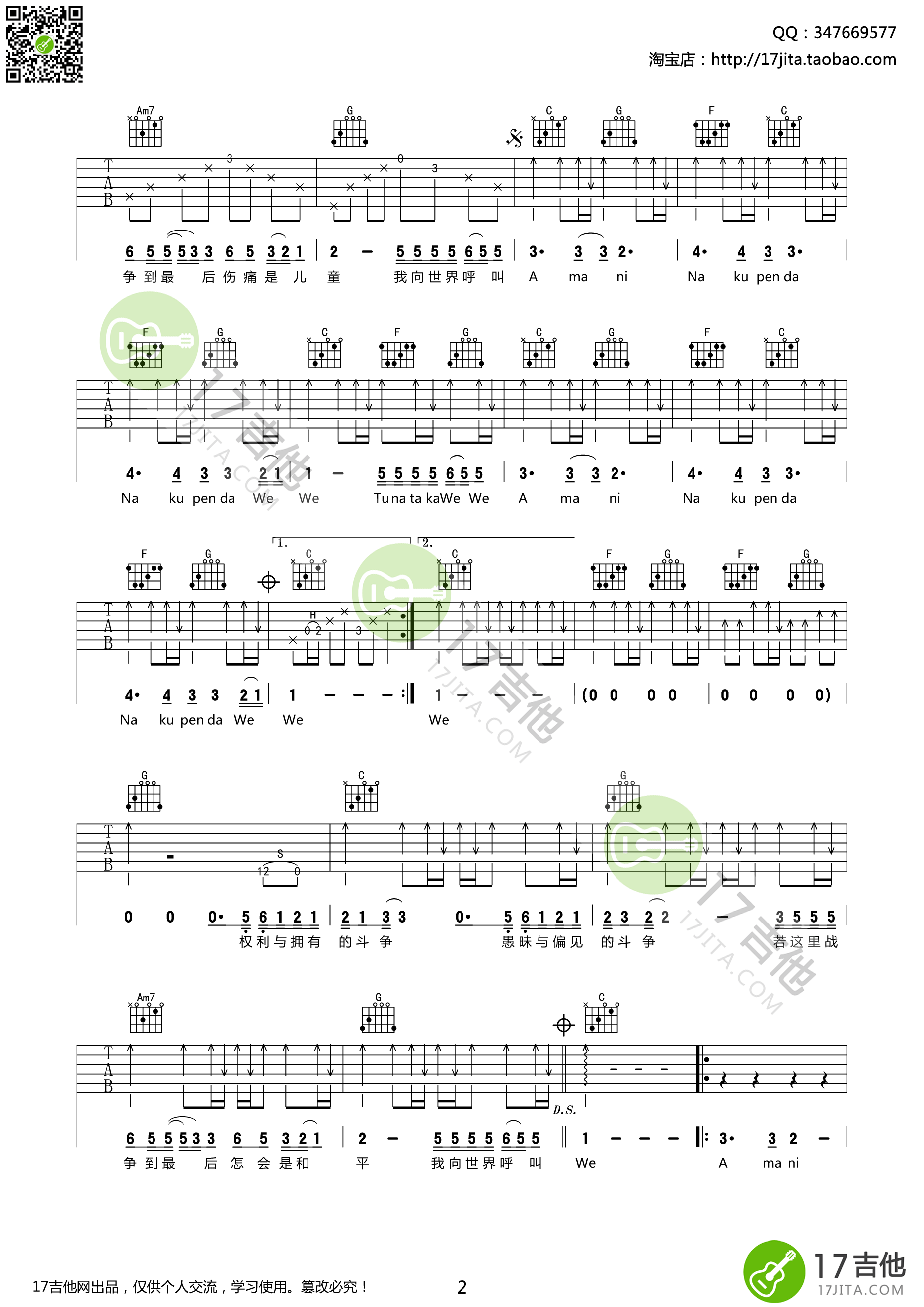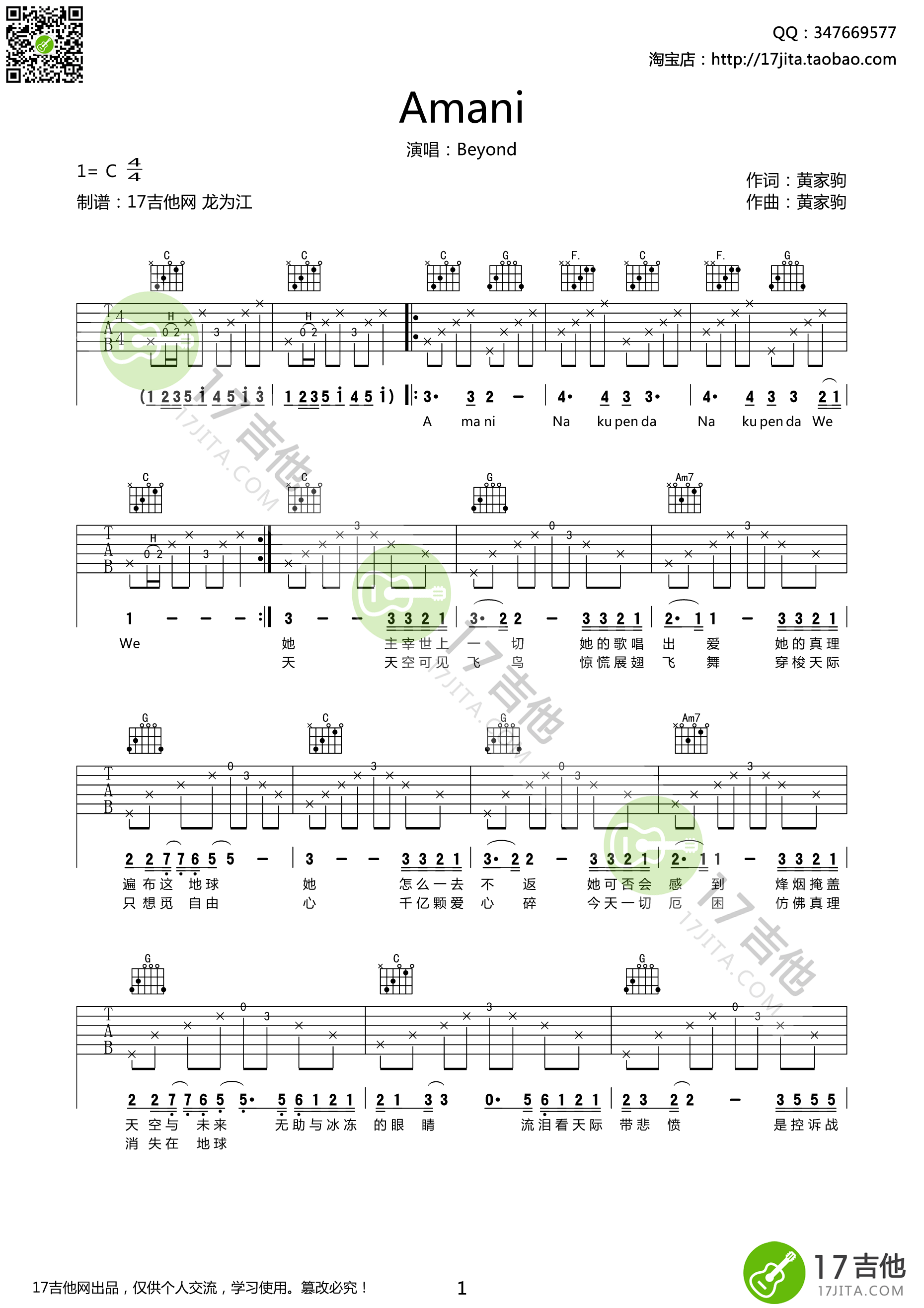 曲谱介绍: Beyond《Amani》吉他弹唱谱,采用C调指法编配,17吉他编配出品,共有3张高清图谱。
