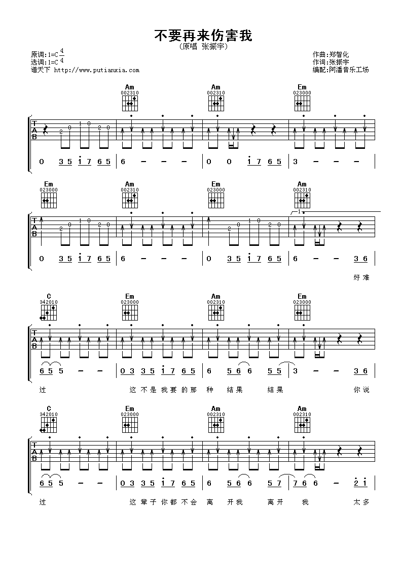 曲谱介绍: 张振宇《不要再来伤害我》吉他弹唱谱,采用C调指法编配,阿潘音乐工场编配出品,共有3张高清图谱。