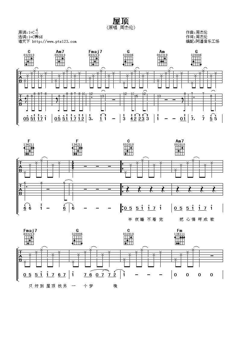 曲谱介绍: 周杰伦《屋顶》吉他弹唱谱,采用C调指法编配,阿潘音乐工场编配出品,共有6张高清图谱。