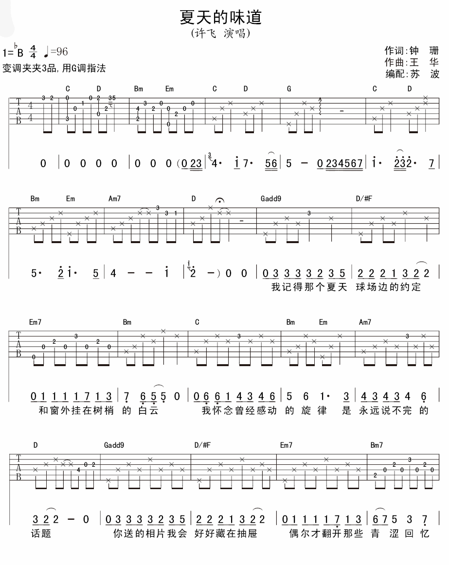 曲谱介绍: 许飞《夏天的味道》吉他弹唱谱,采用B调指法编配,苏波编配出品,共有2张高清图谱,免翻页排版设计。