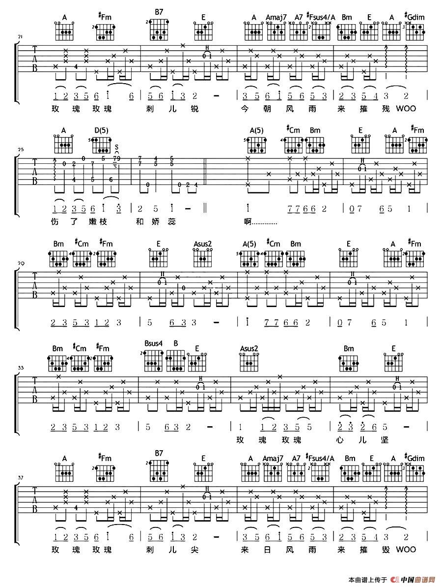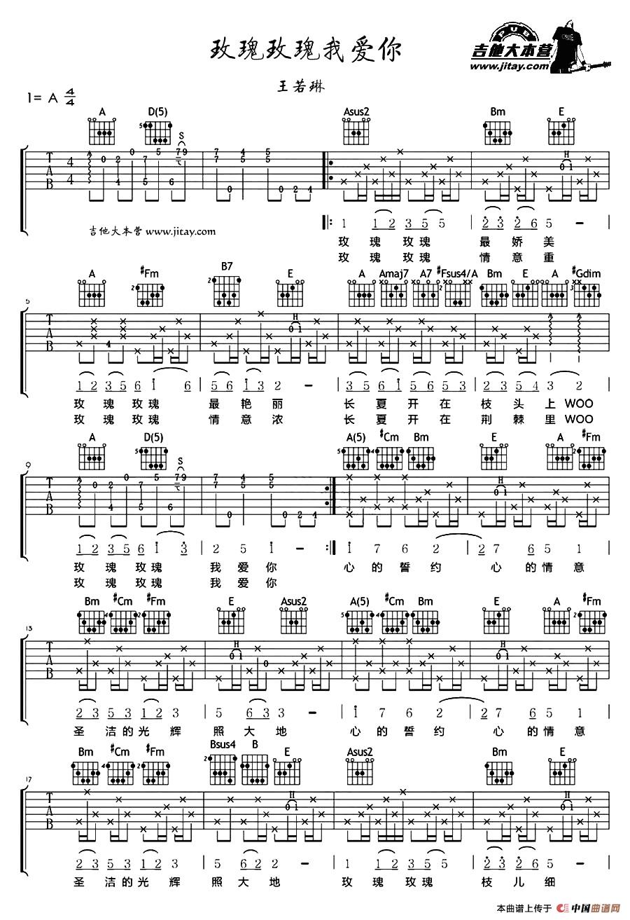 曲谱介绍: 王若琳《玫瑰玫瑰我爱你》吉他弹唱谱,采用A调指法编配,吉他大本营编配出品,共有3张高清图谱。
