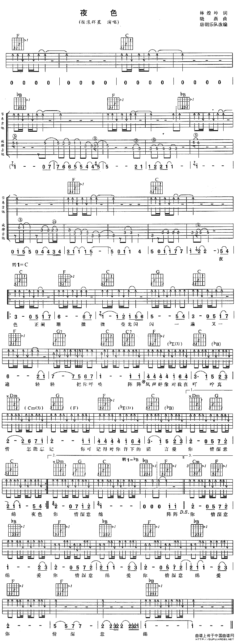 曲谱介绍: 邓丽君《夜色》吉他弹唱谱,采用F调指法编配,共有1张高清图谱,免翻页排版设计。