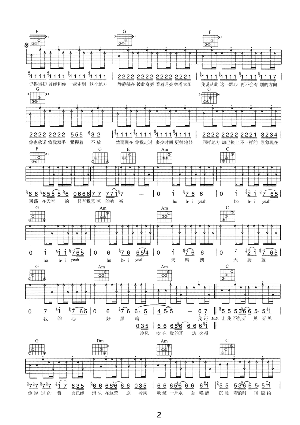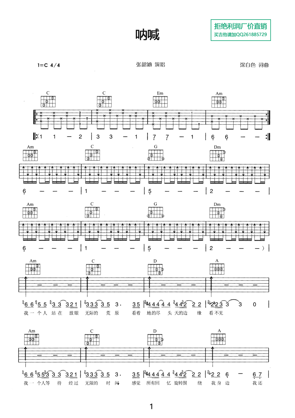 曲谱介绍: 张韶涵《呐喊》吉他弹唱谱,采用C调指法编配,共有3张高清图谱。
