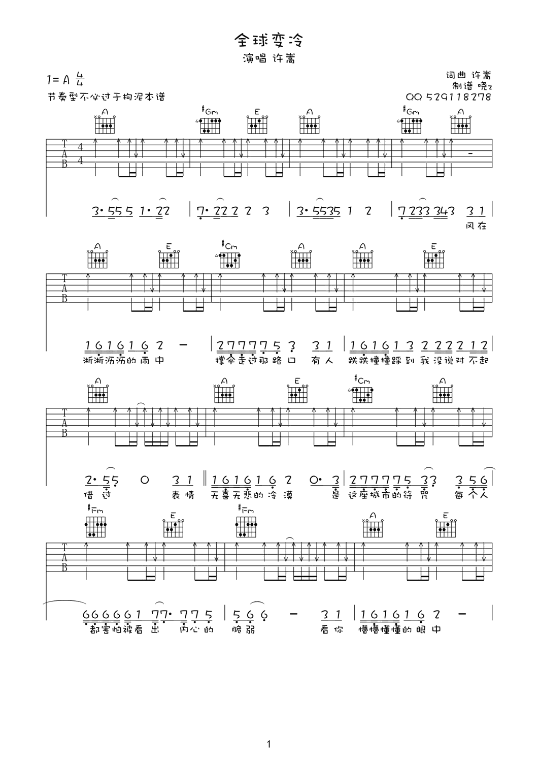 曲谱介绍: 许嵩《全球变冷》吉他弹唱谱,采用A调指法编配,晓Z编配出品,共有2张高清图谱,免翻页排版设计。