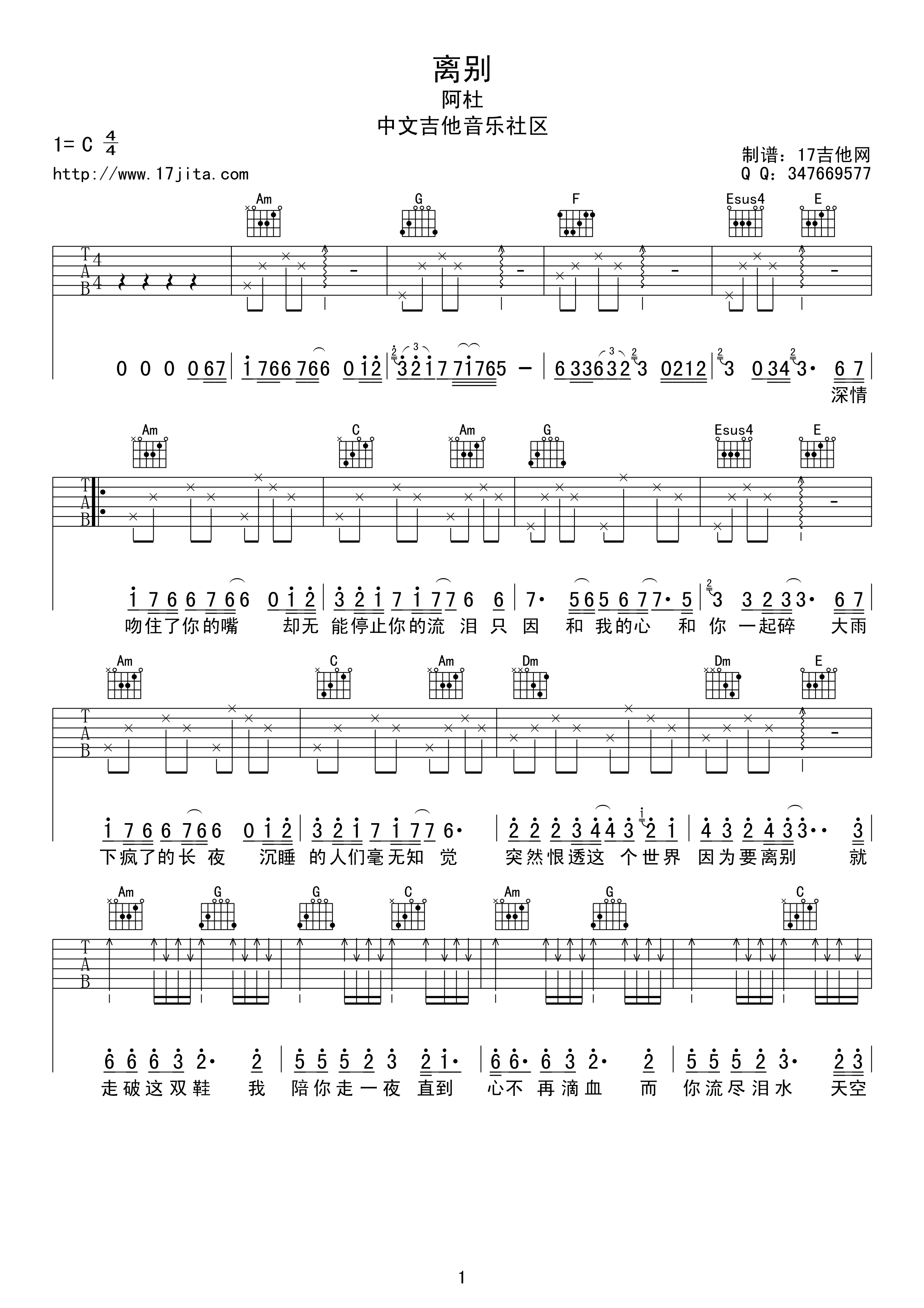 曲谱介绍: 阿杜《离别》吉他弹唱谱,采用C调指法编配,17吉他编配出品,共有2张高清图谱,免翻页排版设计。