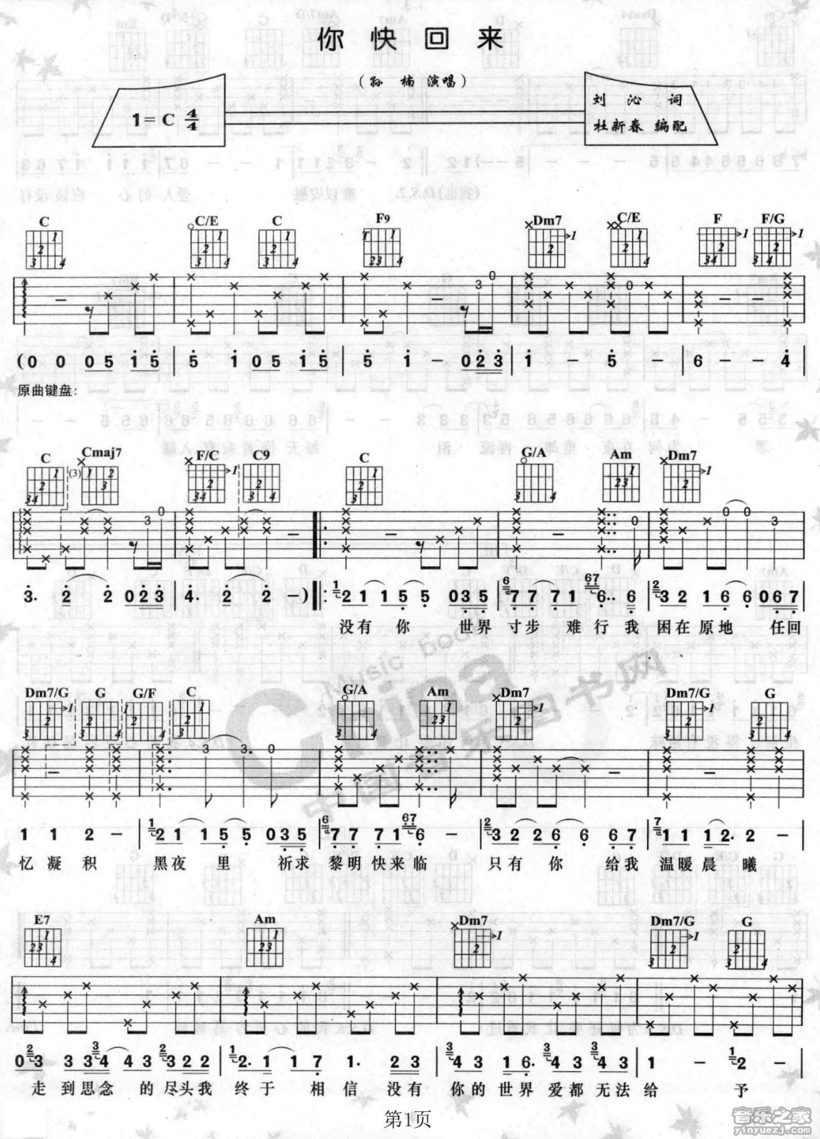 曲谱介绍: 孙楠《你快回来》吉他弹唱谱,采用C调指法编配,音乐图书网编配出品,共有2张高清图谱,免翻页排版设计。