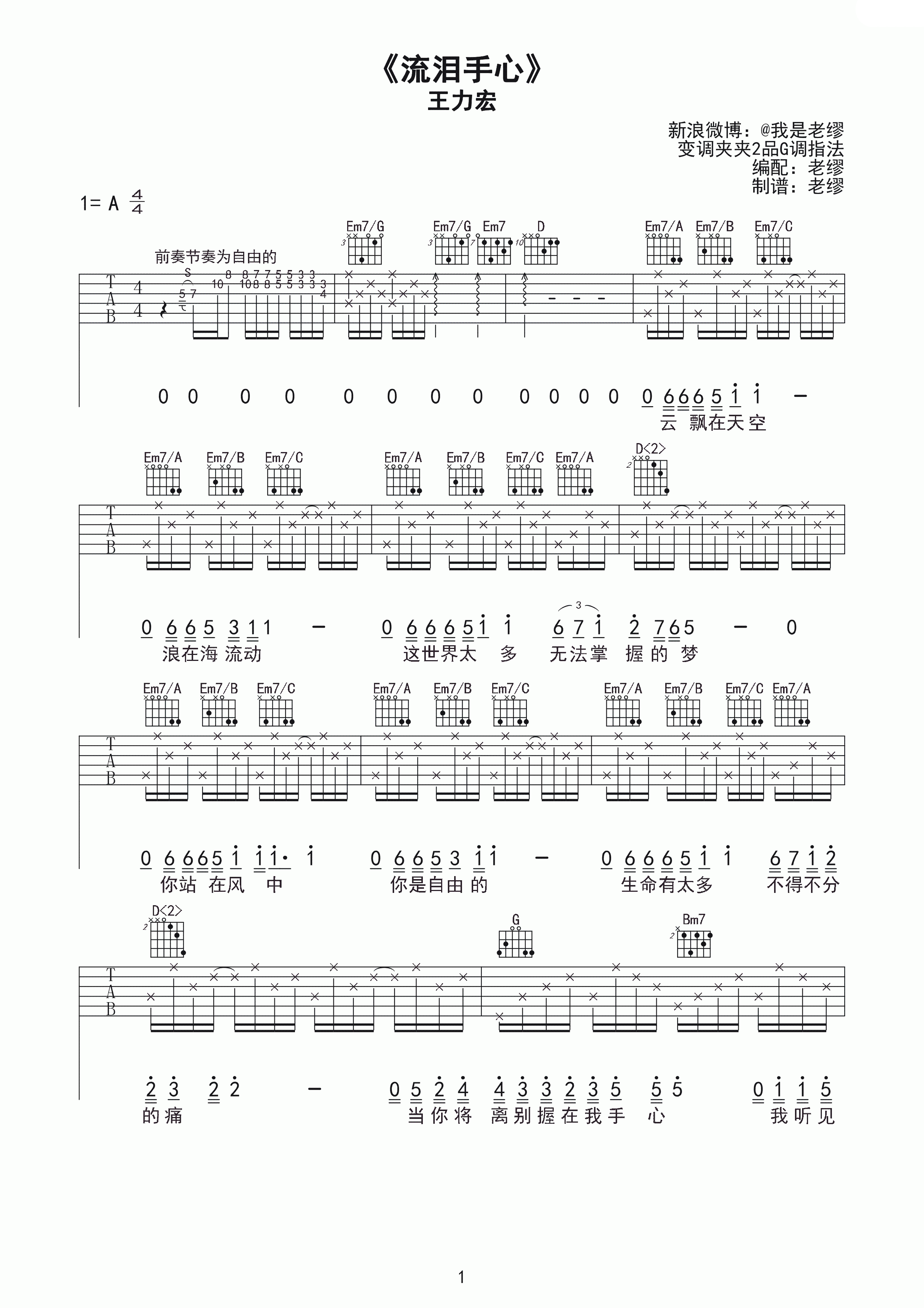 曲谱介绍: 王力宏《流泪手心》吉他弹唱谱,采用A调指法编配,老缪编配出品,共有4张高清图谱。