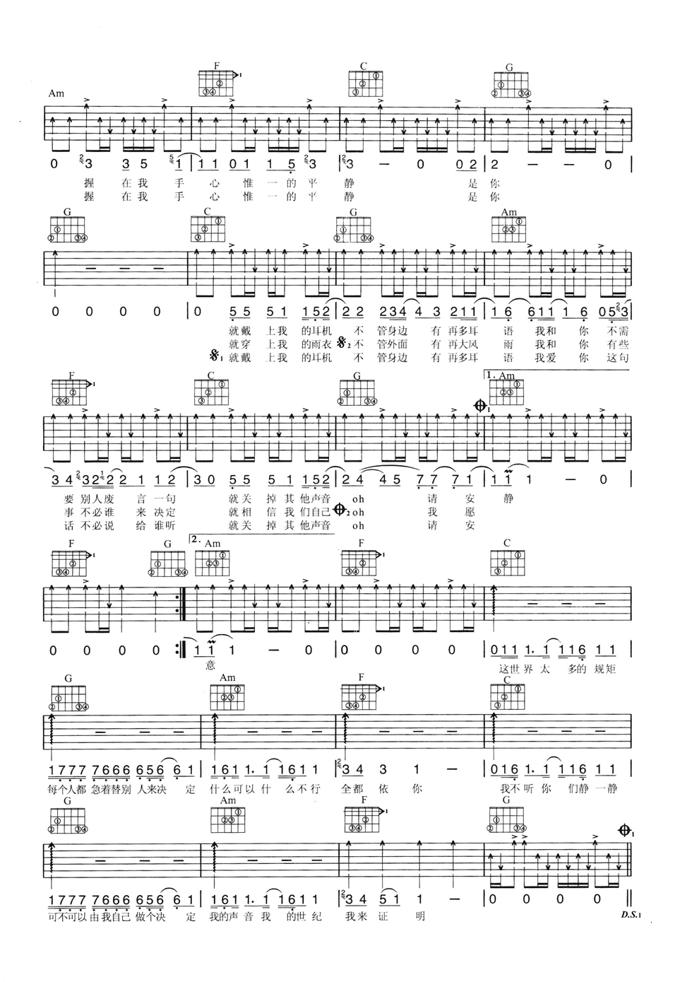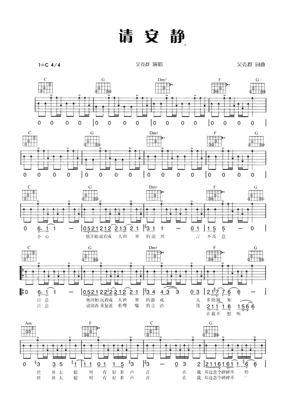 曲谱介绍: 吴克群《请安静》吉他弹唱谱,采用C调指法编配,共有3张高清图谱。