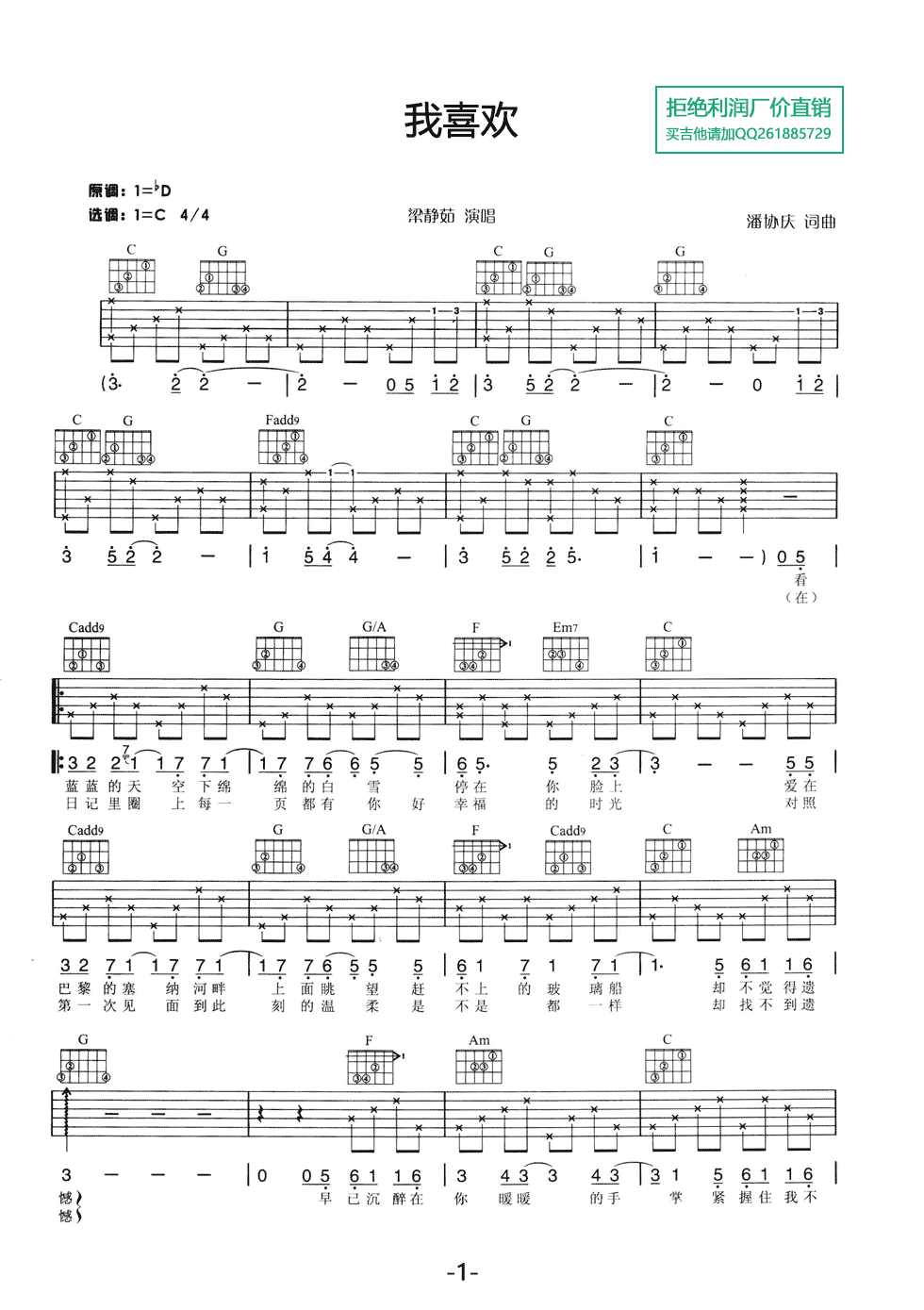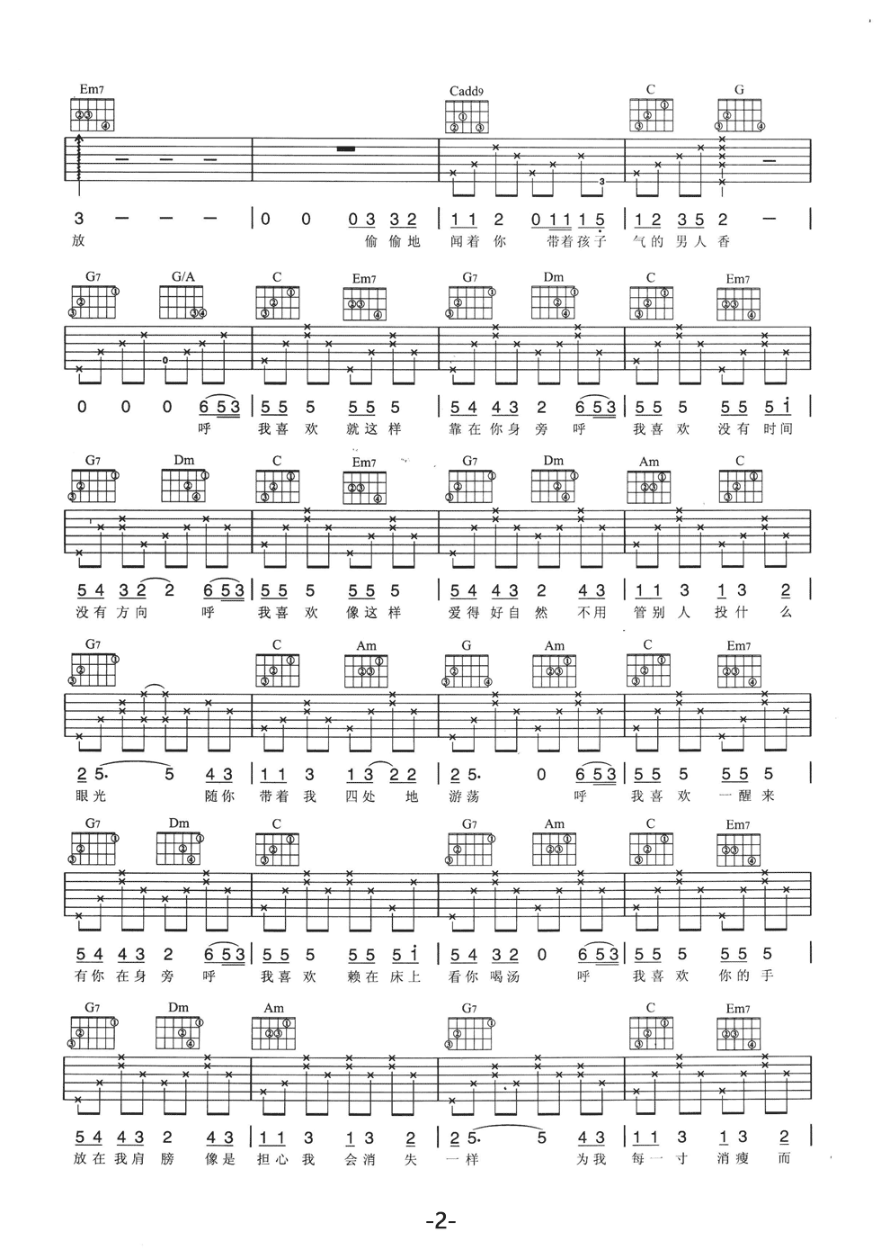 曲谱介绍: 附前奏《我喜欢》吉他弹唱谱,采用C调指法编配,共有3张高清图谱。