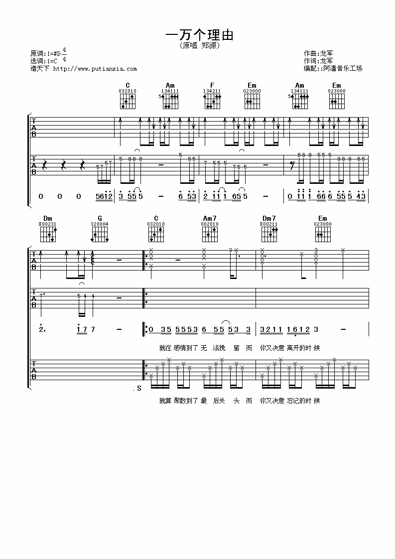 曲谱介绍: 郑源《一万个理由》吉他弹唱谱,采用C调指法编配,阿潘音乐工场编配出品,共有4张高清图谱。