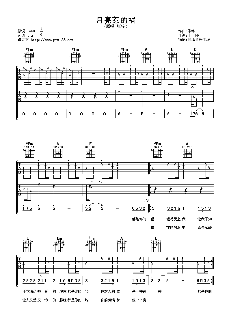 曲谱介绍: 张宇《月亮惹的祸》吉他弹唱谱,采用A调指法编配,阿潘音乐工厂编配出品,共有5张高清图谱。