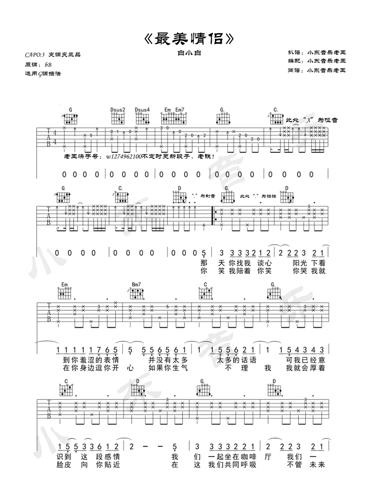 曲谱介绍: 最美情侣吉他谱,白小白演唱,变调夹三品位置,选用G调指法。全网爆红的爱情歌曲《最美情侣》,旋律悦耳动听,歌词直白上口,是当前网络平台传唱率超高的魔性洗脑神曲。