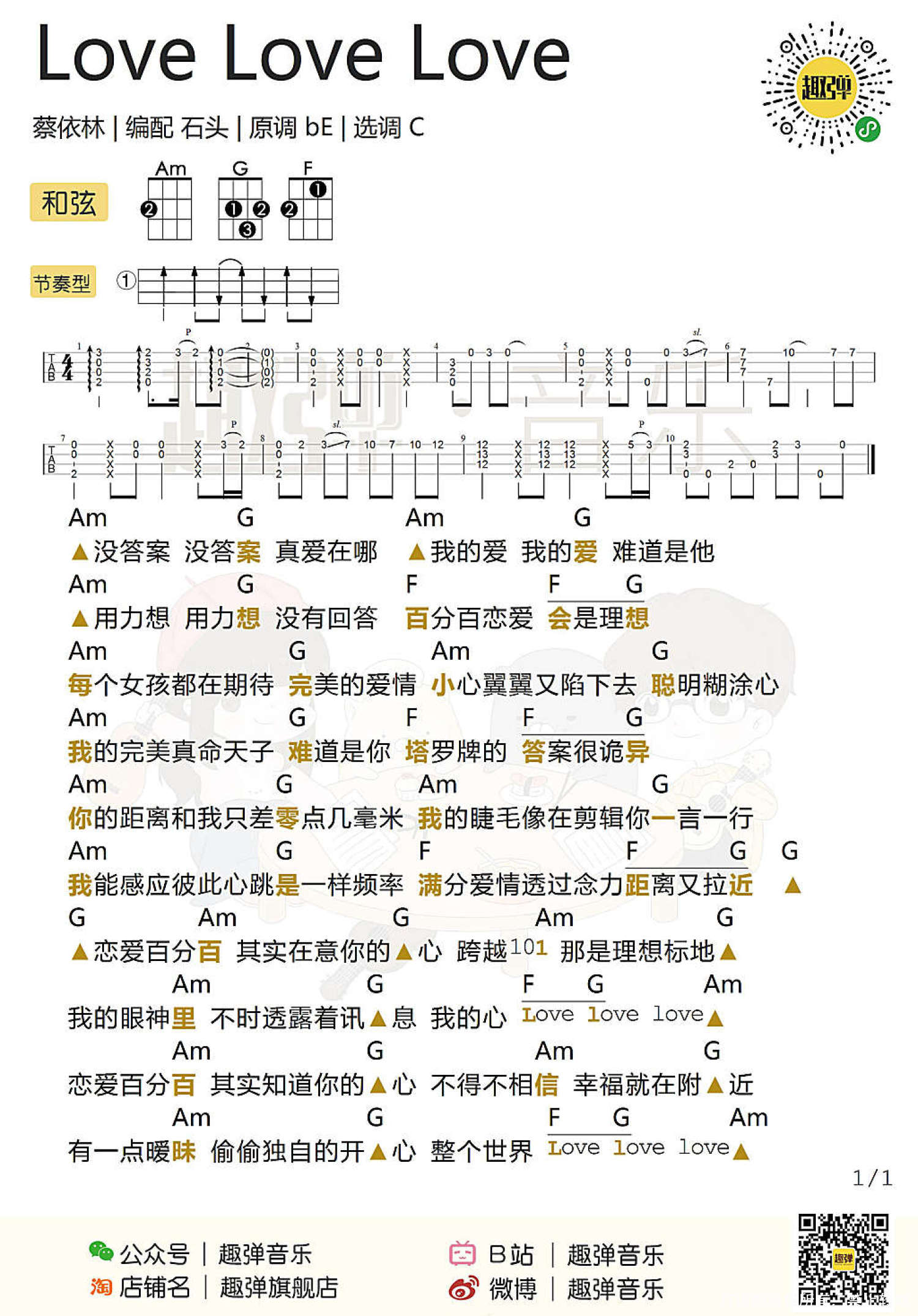 曲谱介绍: Aloha~小伙伴们 今天跟大家分享的是一首超甜的歌曲 来自蔡依林的「Love Love Love」 甜蜜的氛围中又透漏着一丝诱惑 想要百分百占据你的心~   《Love Love Love》尤克里里弹唱谱