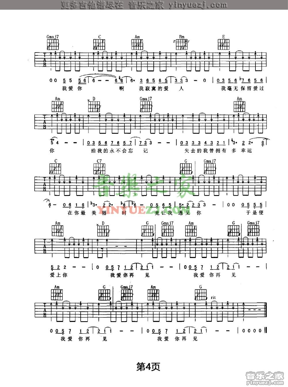 曲谱介绍: 朴树《我爱你再见》吉他弹唱谱,采用G调指法编配,音乐之家编配出品,共有4张高清图谱。
