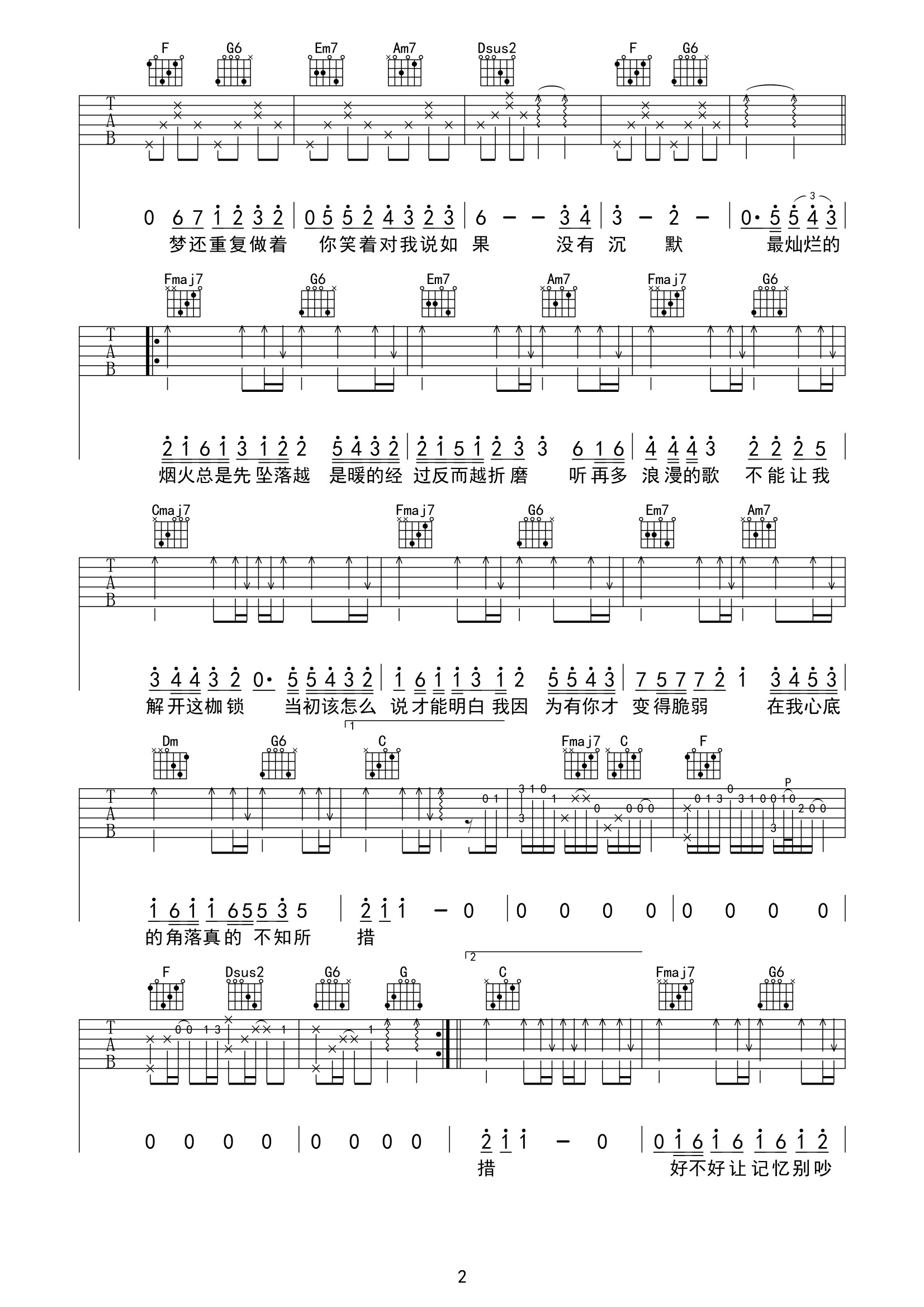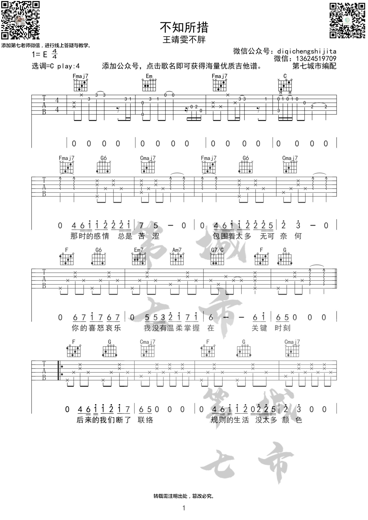 曲谱介绍: 王靖雯《不知所措》吉他弹唱谱,采用C调指法编配,第七城市编配出品,共有3张高清图谱。
