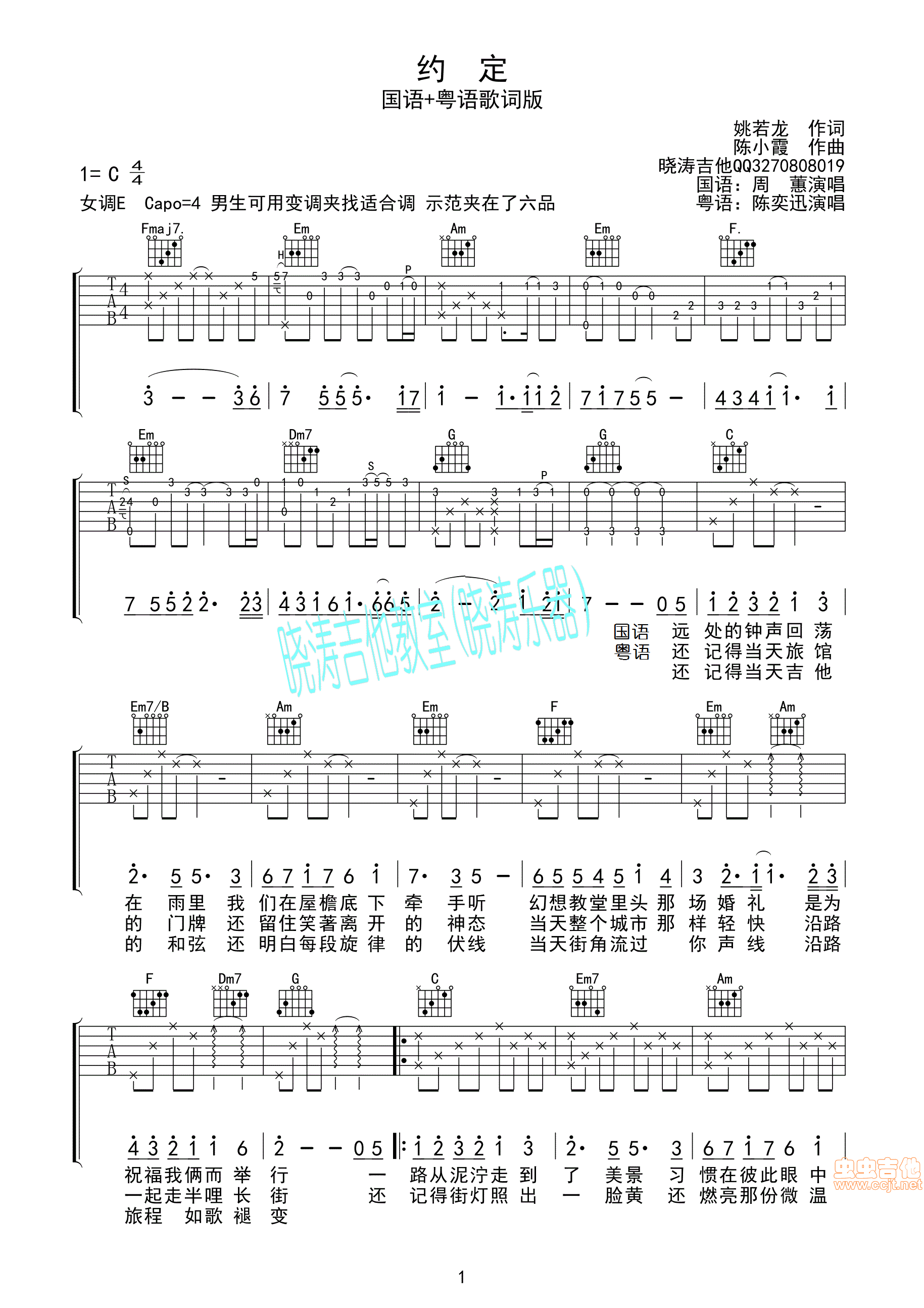 曲谱介绍: 周惠《约会》吉他弹唱谱,采用C调指法编配,晓涛吉他教室编配出品,共有3张高清图谱。