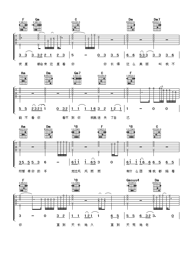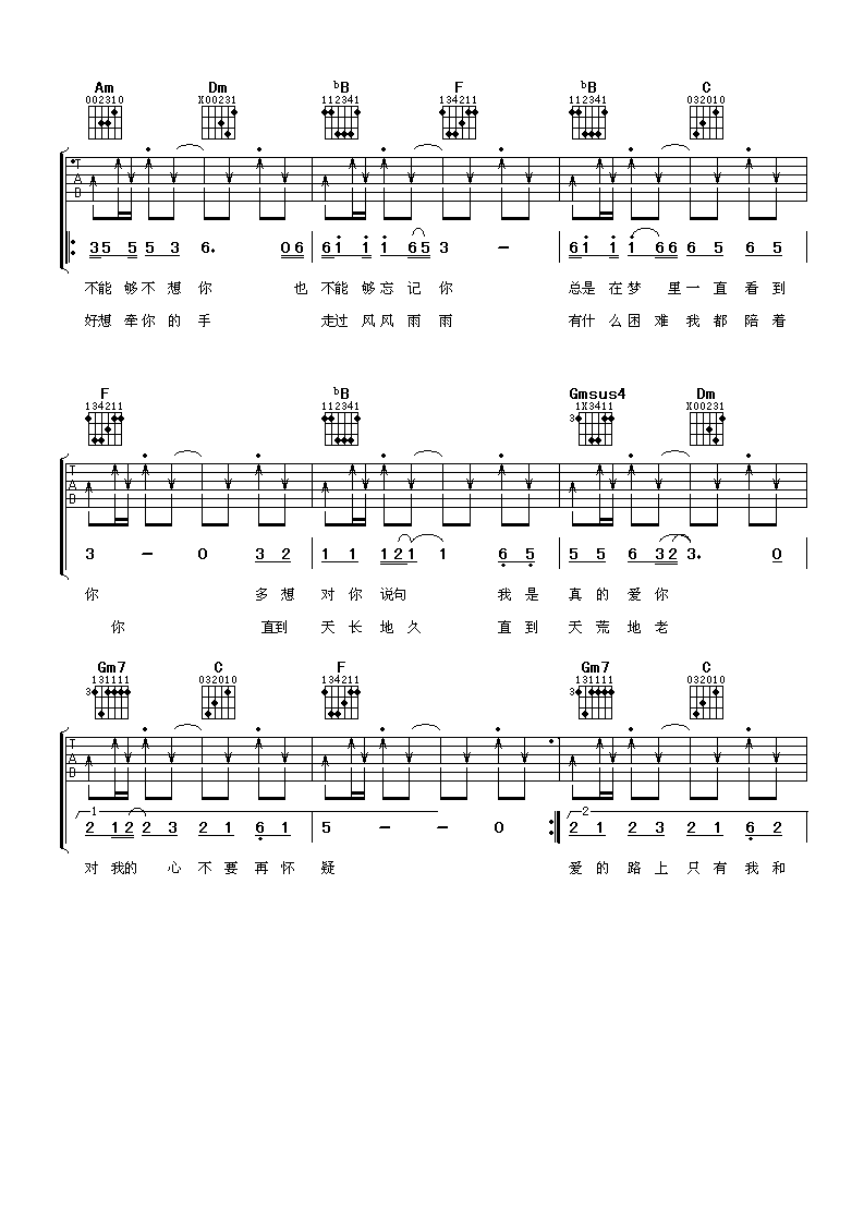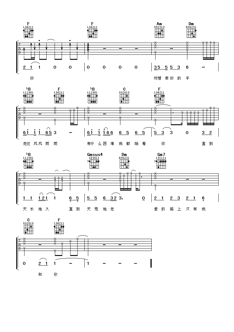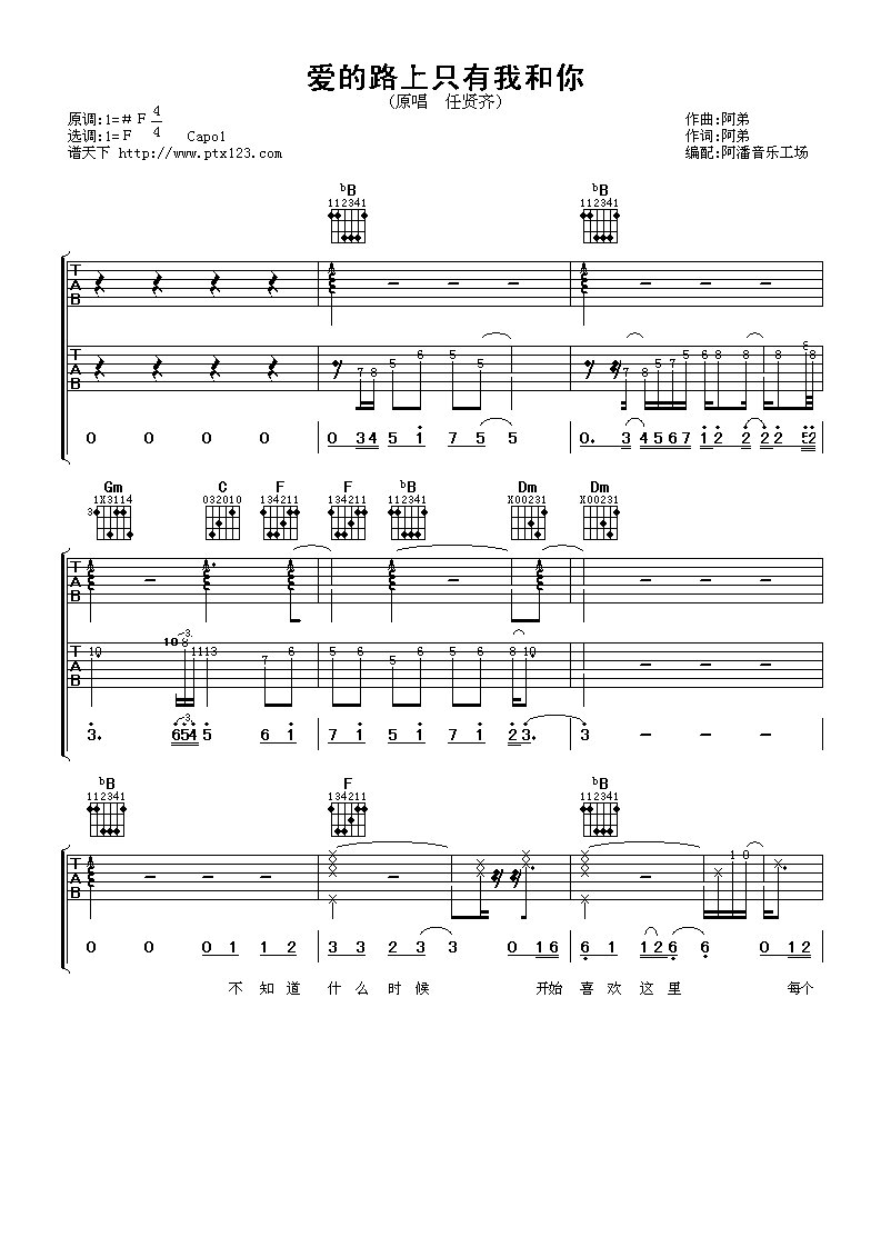 曲谱介绍: 任贤齐《爱的路上只有我和你》吉他弹唱谱,采用F调指法编配,阿潘音乐工场编配出品,共有6张高清图谱。