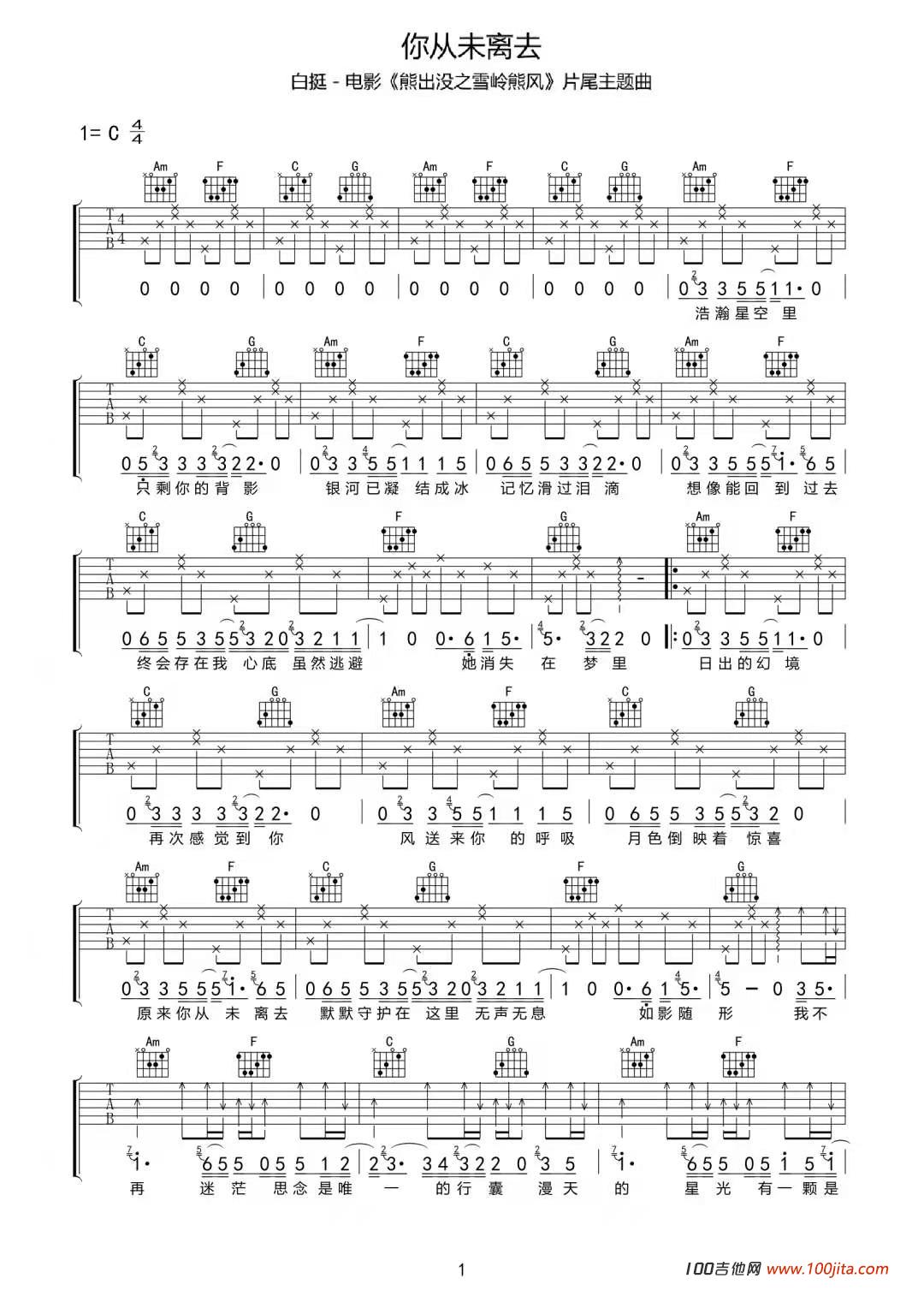 曲谱介绍: 《你从未离去》吉他谱是根据白挺唱的一首歌曲编配的谱子。吉他谱采用C调和弦编配,非常好听的一首歌曲。