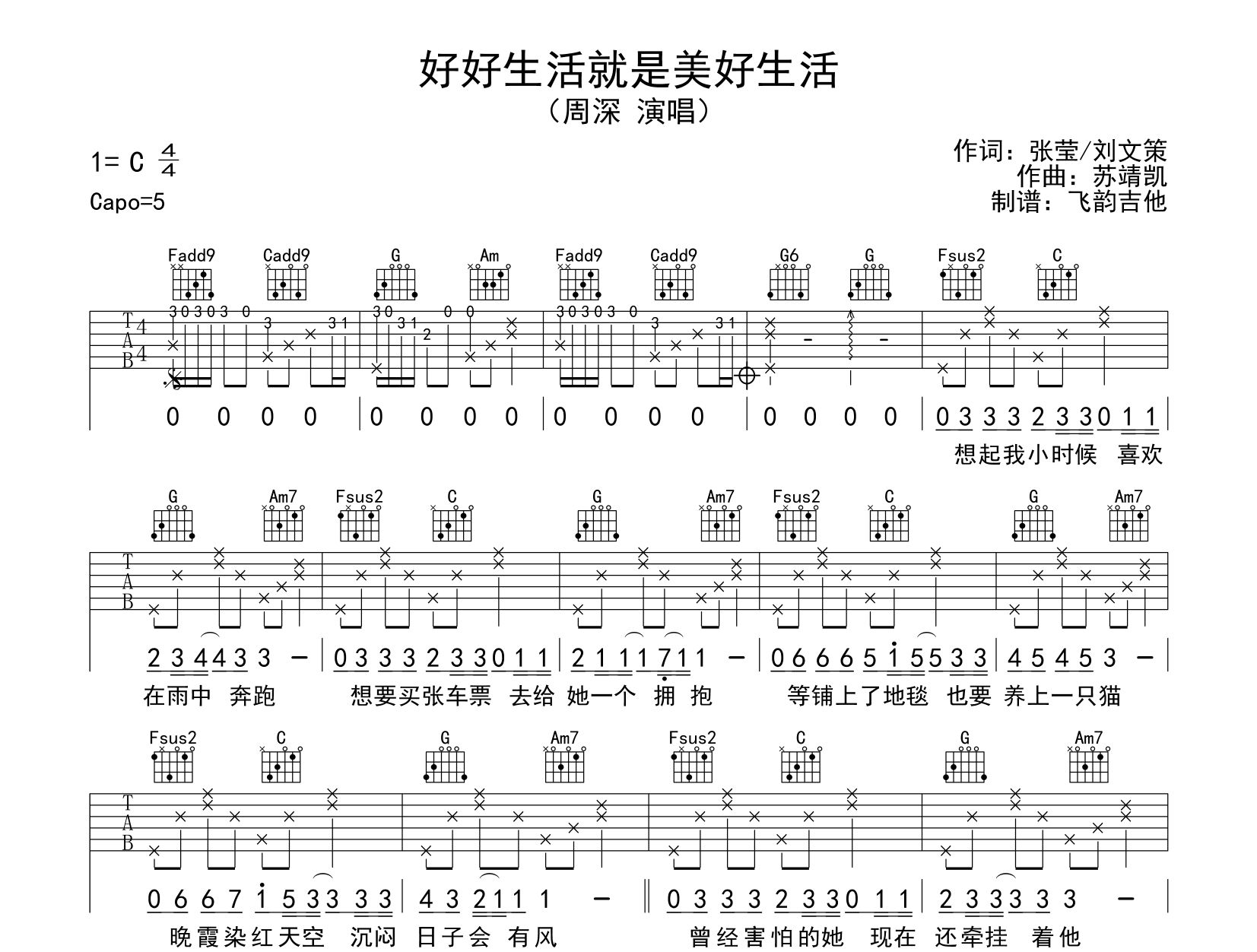 曲谱介绍: 周深《好好生活就是美好生活》吉他弹唱谱,采用C调指法编配,共有2张高清图谱,免翻页排版设计。