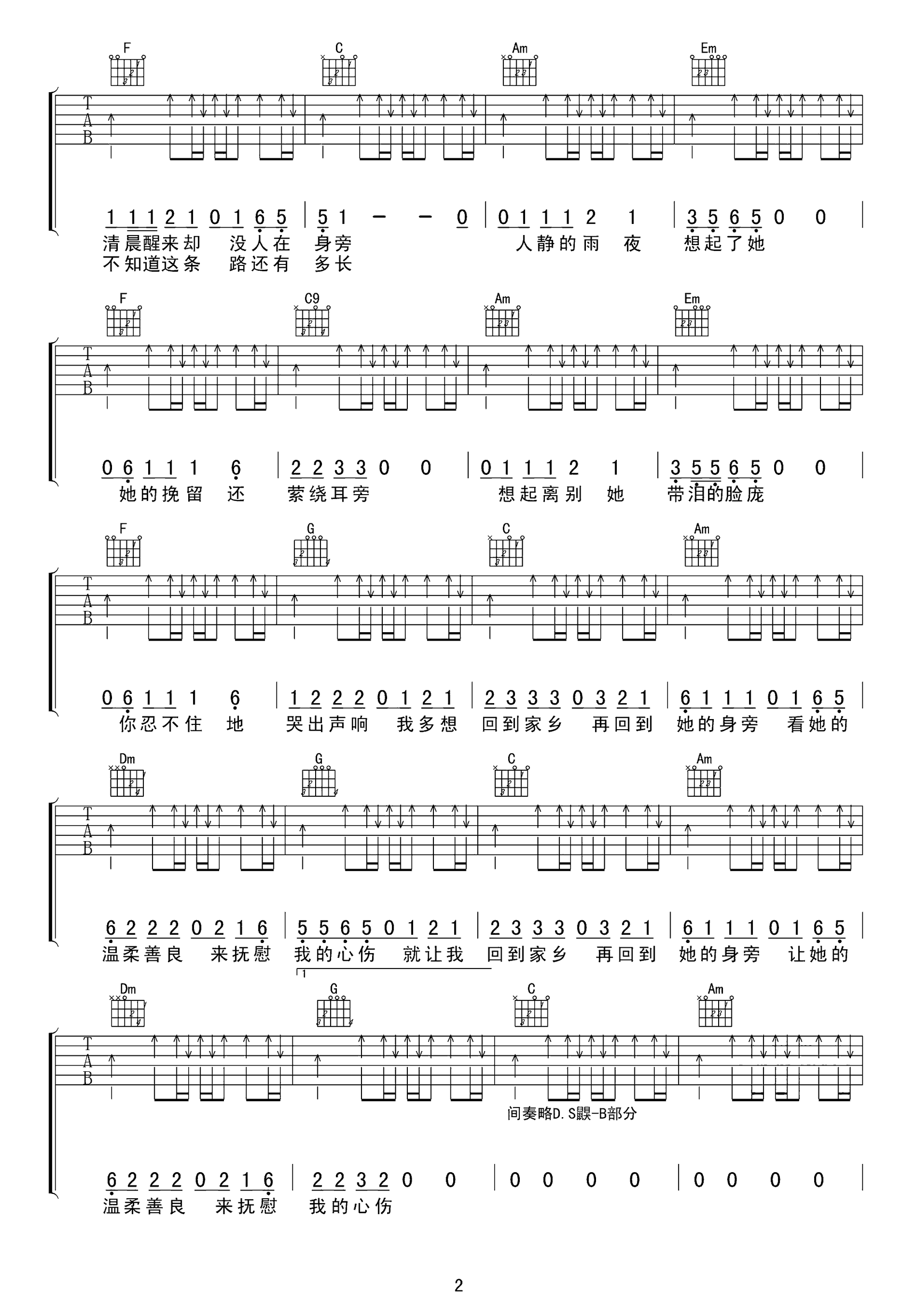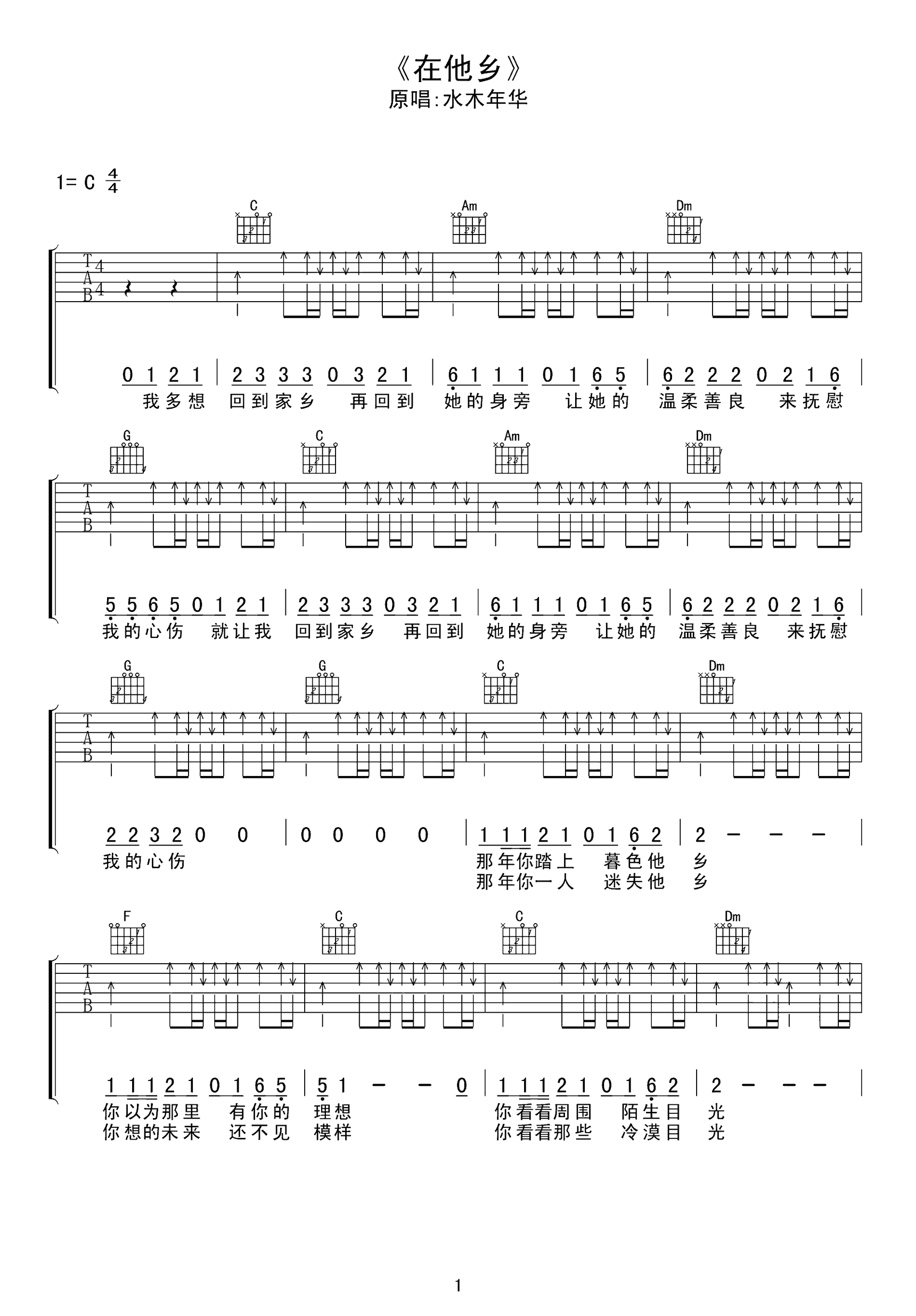 曲谱介绍: 水木年华《在他乡》吉他弹唱谱,采用C调指法编配,共有4张高清图谱。