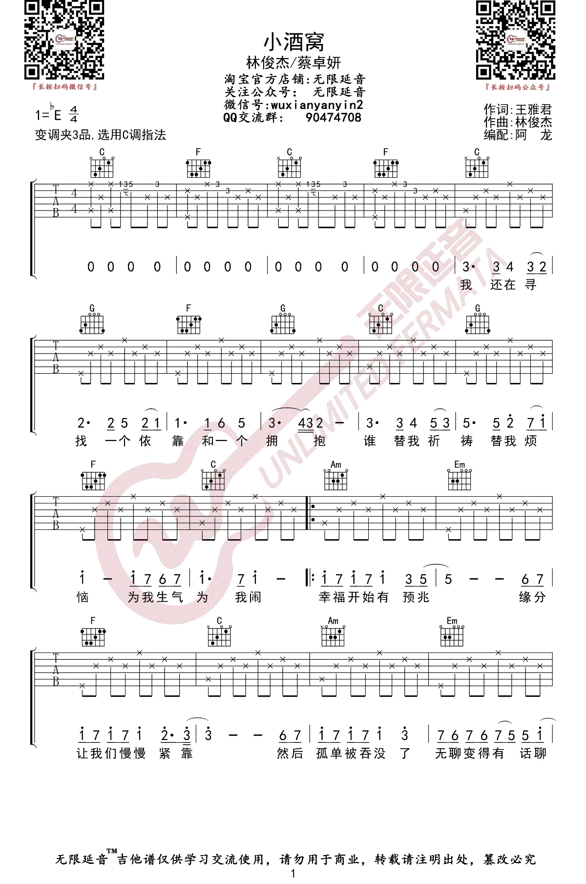 曲谱介绍: 小酒窝吉他谱,林俊杰和蔡卓妍演唱, 一首经典的男女对唱情歌。小酒窝吉他弹唱谱,三张图片六线谱。歌曲采用C调指法编配,变调夹三品。 一首充满甜蜜恋爱气息的歌曲,轻快温暖,唱出恋人之间的纯爱情愫。吉他弹唱不难,琴友们可以独唱也可以找搭档一起弹唱哦~