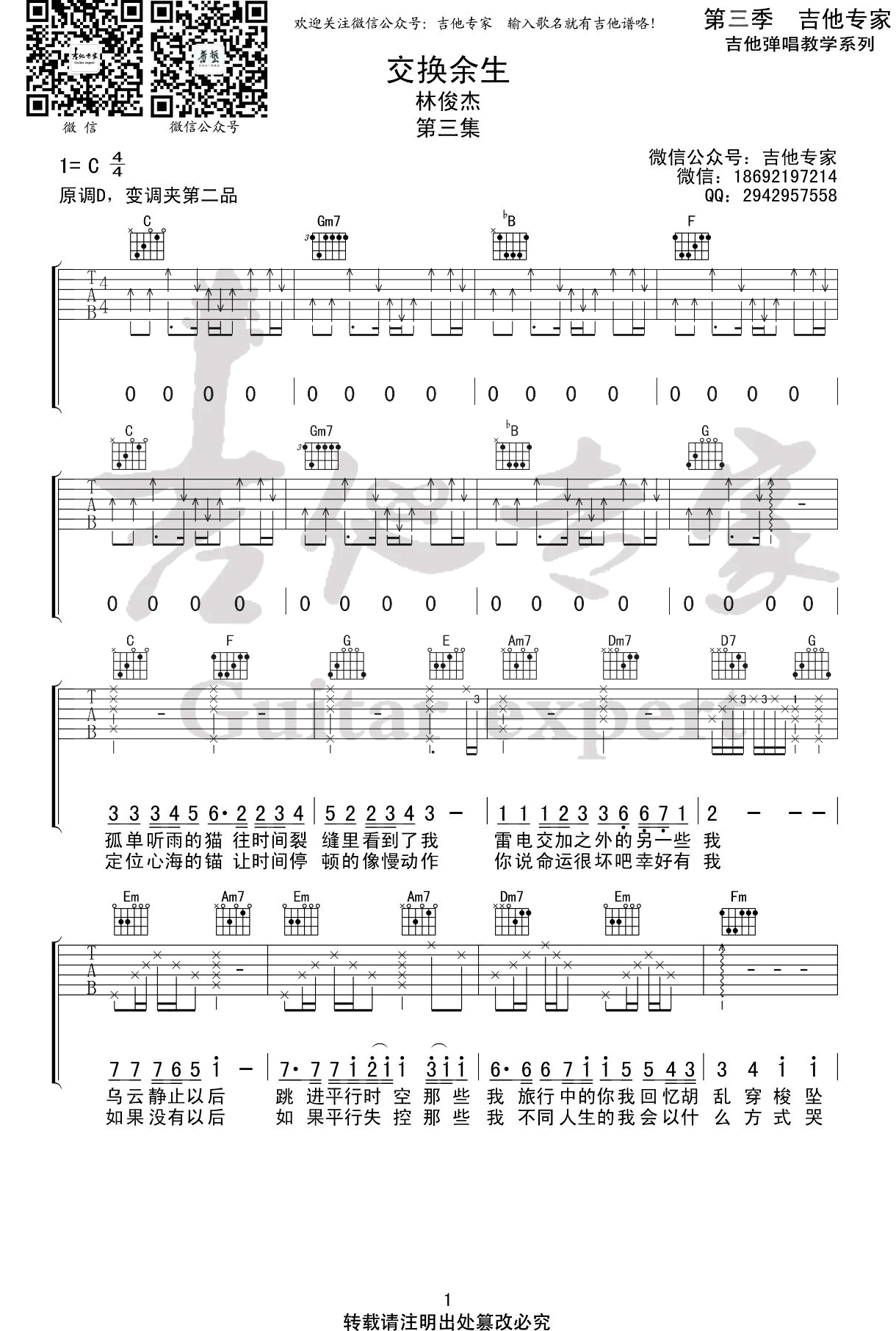 曲谱介绍: 交换余生吉他谱,林俊杰演唱,送给每一个平行时空的你我。交换余生吉他弹唱谱,原调D选用C调指法,变调夹夹第二品。 夜深人静的时刻,请试着请用心去倾听, 在起伏伤感的旋律里,开展一次灵魂的时空之旅,曾经的过往,故事里的你们,是否有过遗憾,又错过了彼此,如果有机会,你又想和谁 《交换余生》?