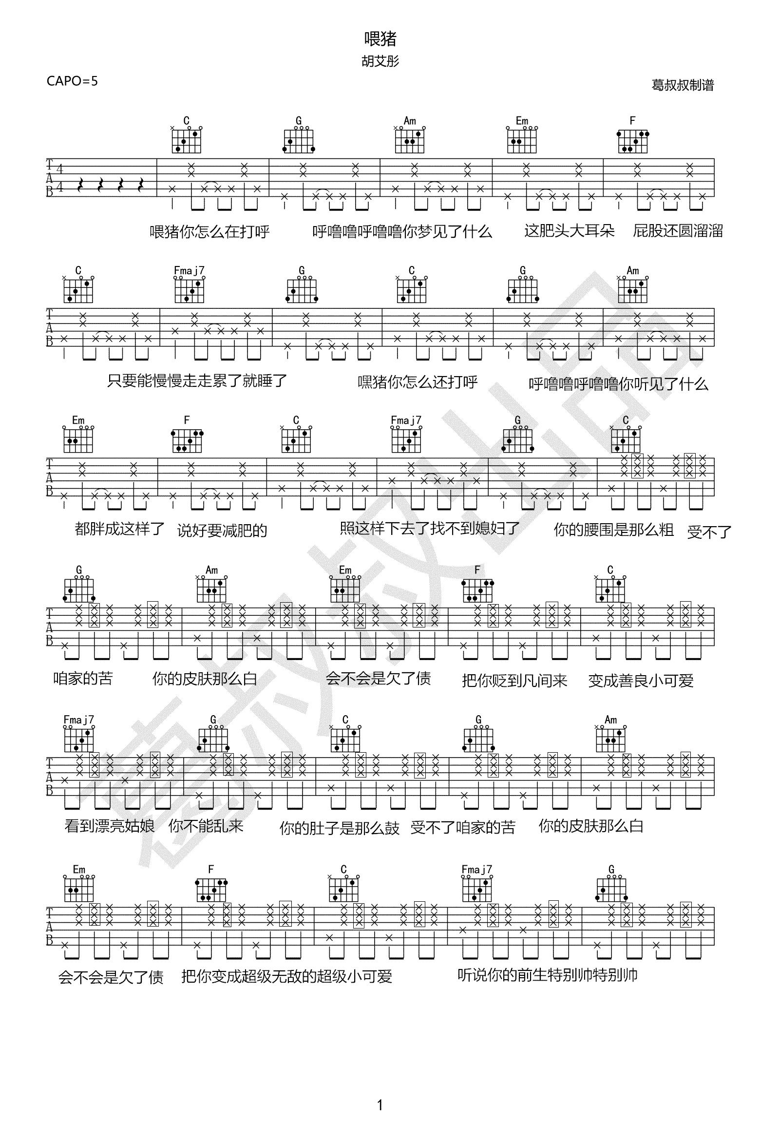 喂猪吉他谱 - 胡艾彤 - C调吉他弹唱谱
