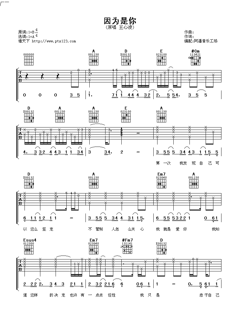 曲谱介绍: 王心凌《因为是你》吉他弹唱谱,采用A调指法编配,阿潘音乐工场编配出品,共有5张高清图谱。