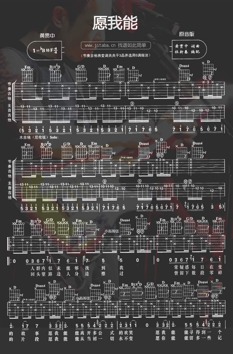 曲谱介绍: 黄贯中《愿我能》吉他弹唱谱,采用B调指法编配,吉他吧编配出品,共有2张高清图谱,免翻页排版设计。