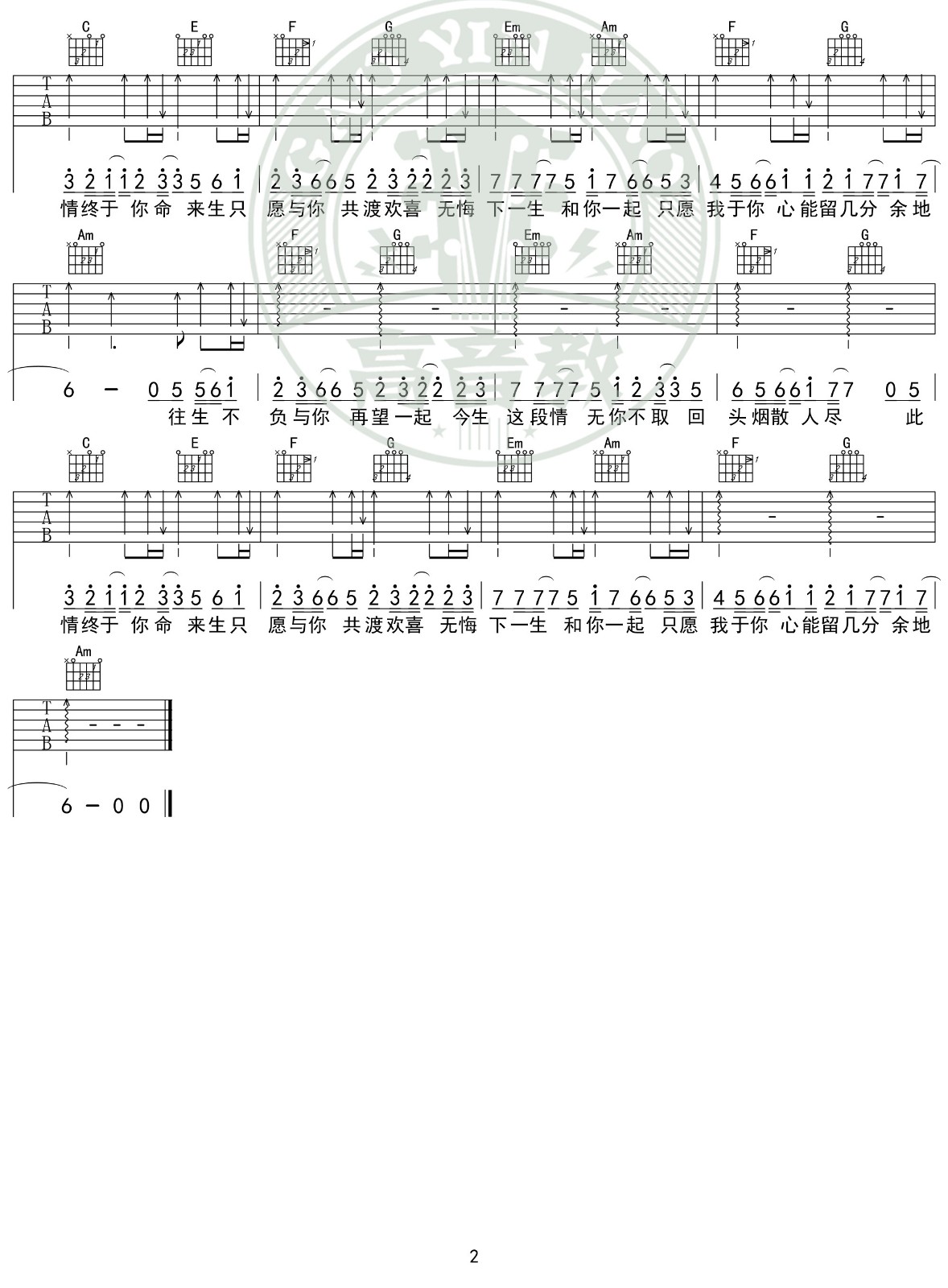 曲谱介绍: 林家源《不负于你》吉他弹唱谱,采用C调指法编配,高音教编配出品,共有2张高清图谱,免翻页排版设计。