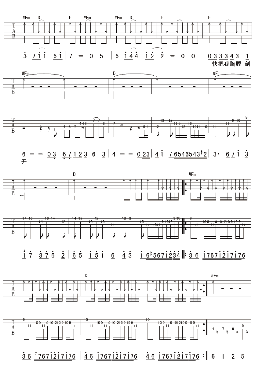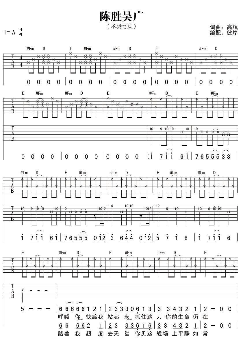 曲谱介绍: 超载乐队《陈胜吴广》吉他弹唱谱,采用A调指法编配,彼岸吉他编配出品,共有4张高清图谱。