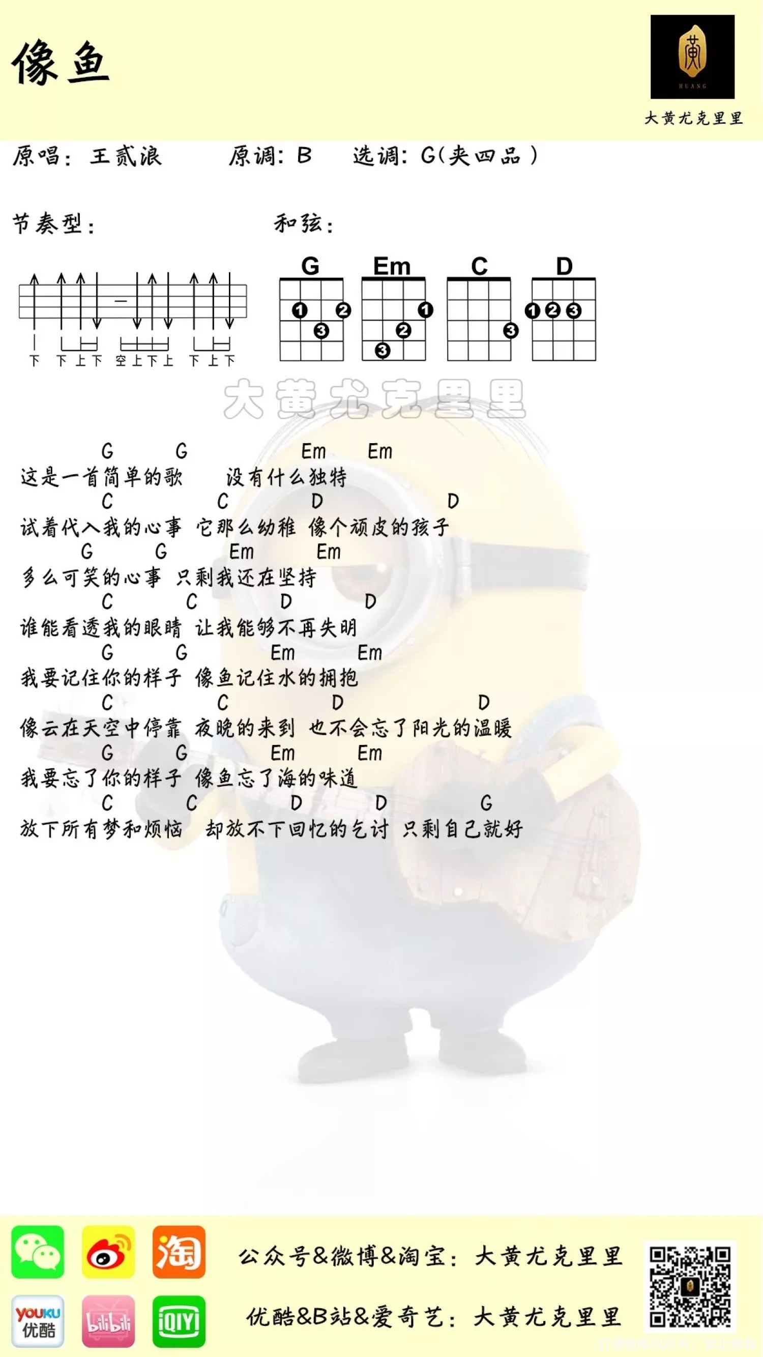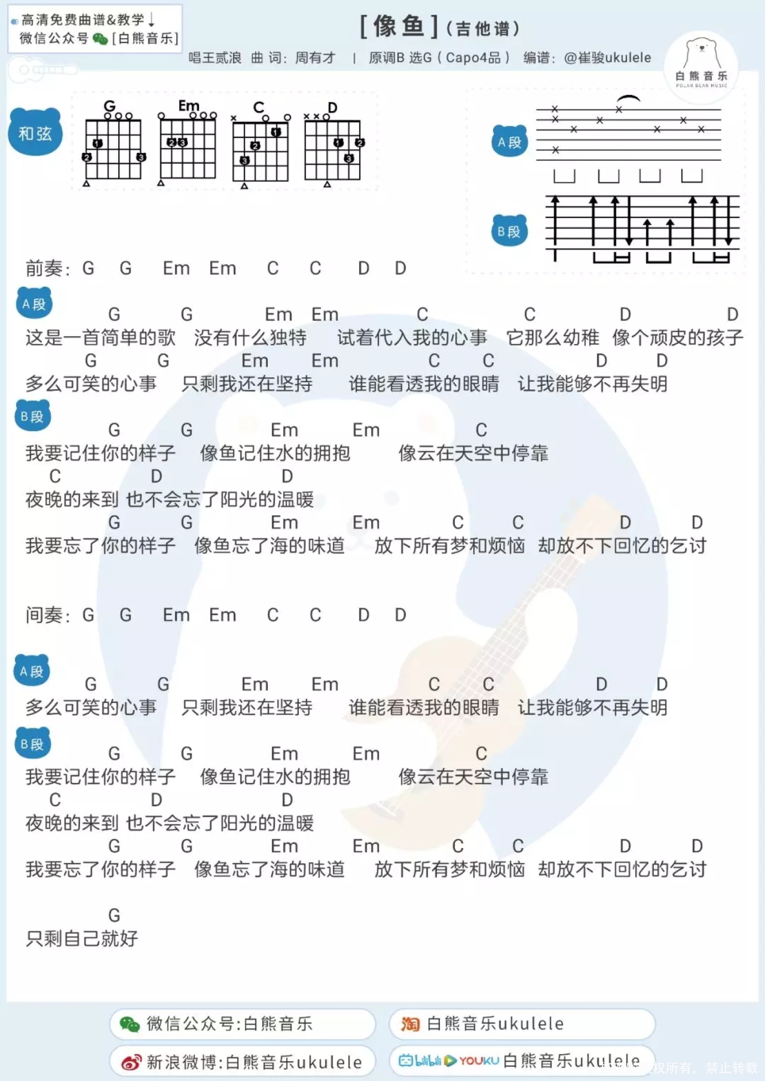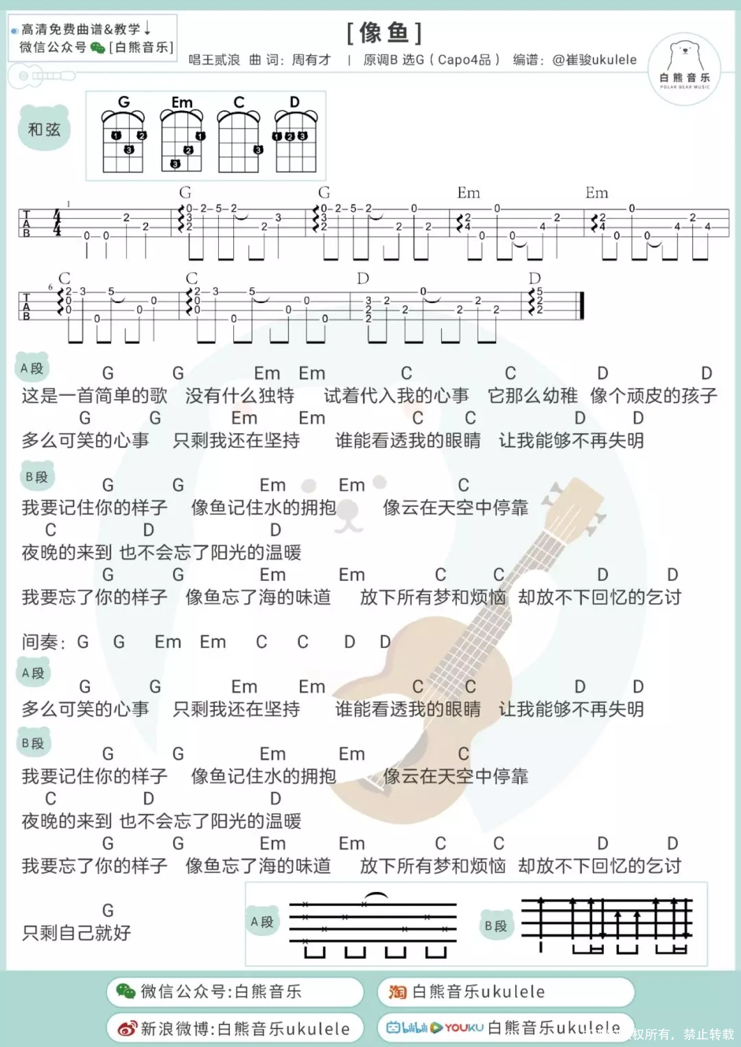 曲谱介绍: Aloha~今天跟大家分享的是 来自王贰浪的「像鱼」 这首歌讲述的心事 只不过这心事只让自己觉得多余 甚至幼稚~   像鱼ukulele谱   C调版:   G调版: 白熊G调版 像鱼吉他谱