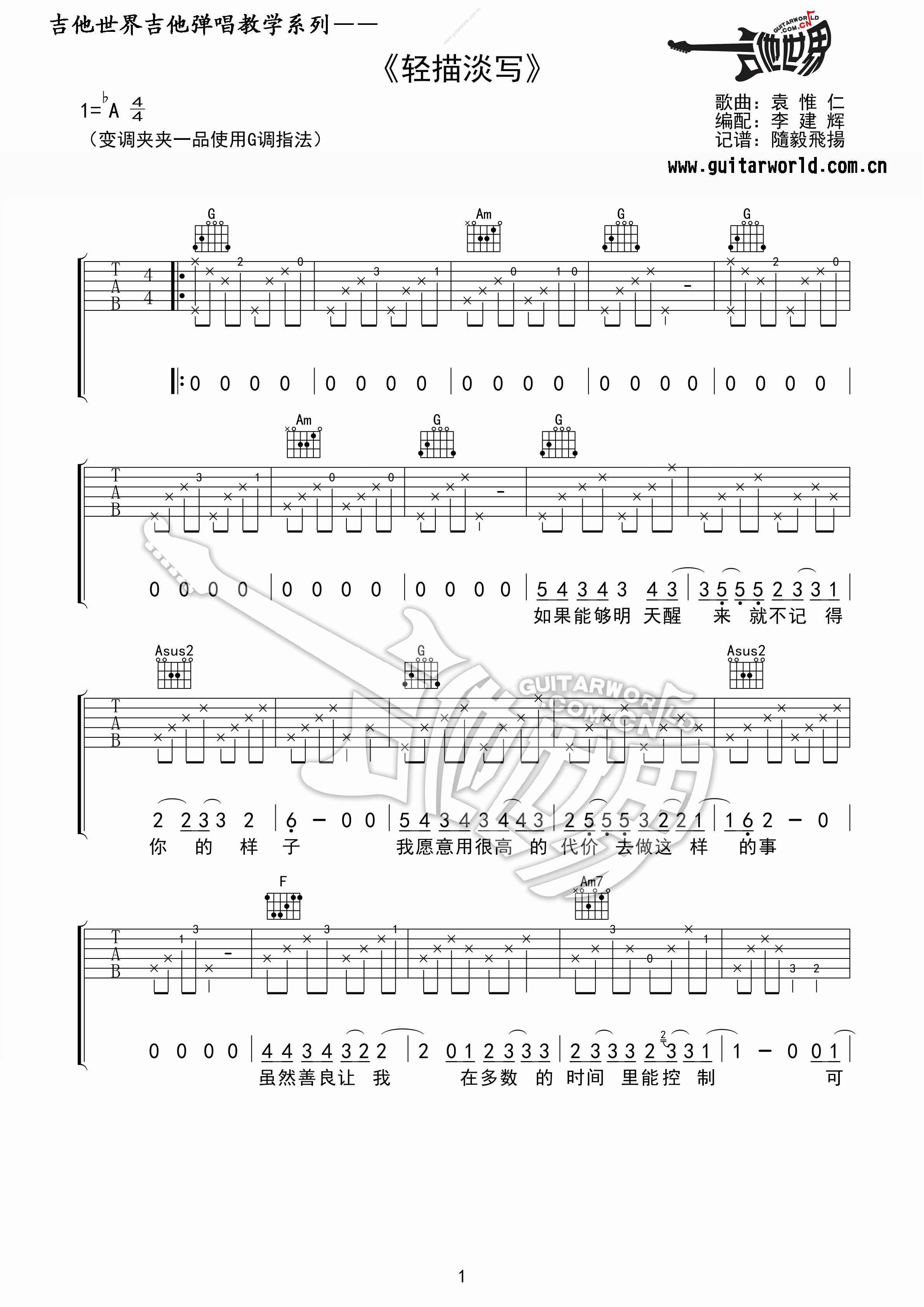 曲谱介绍: 袁惟仁《轻描淡写》吉他弹唱谱,采用A调指法编配,吉他世界编配出品,共有3张高清图谱。