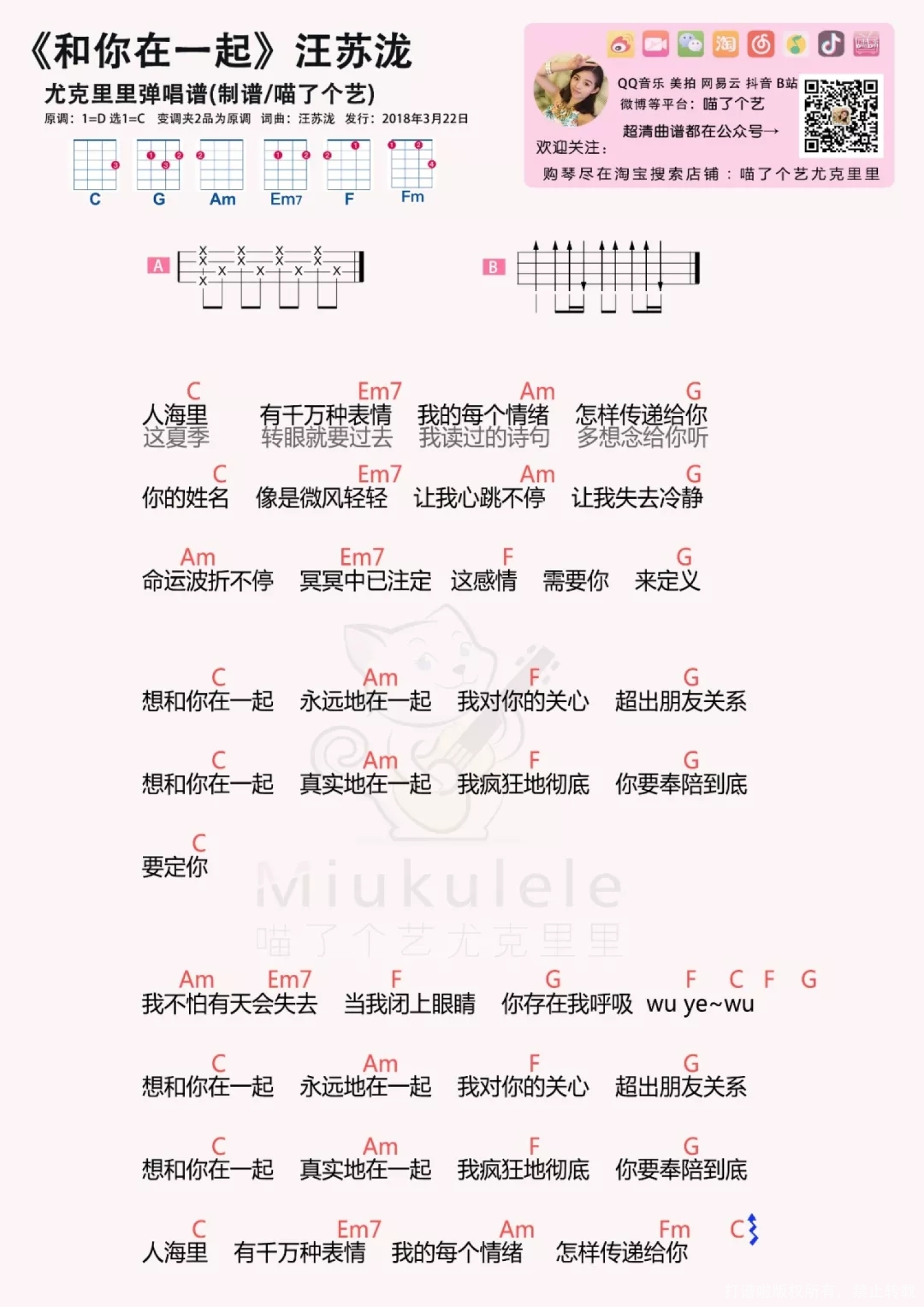 曲谱介绍: 李志《和你在一起》尤克里里谱,共有1张高清图谱,免翻页排版设计。