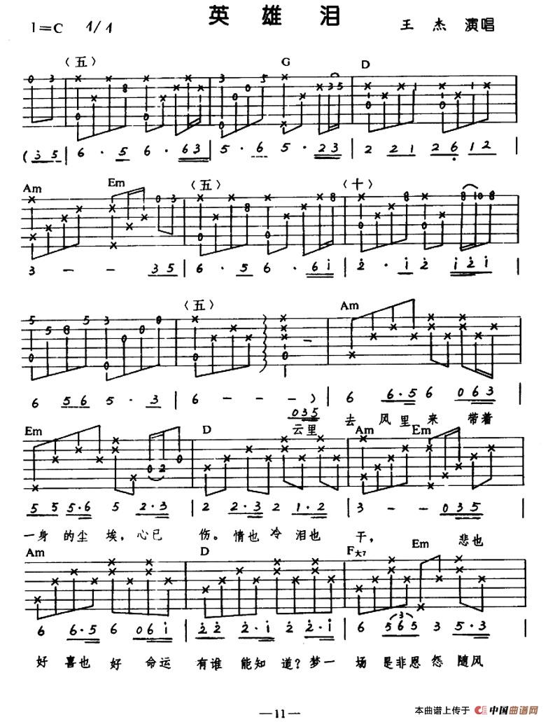 英雄泪吉他谱 - 王杰 - C调吉他弹唱谱