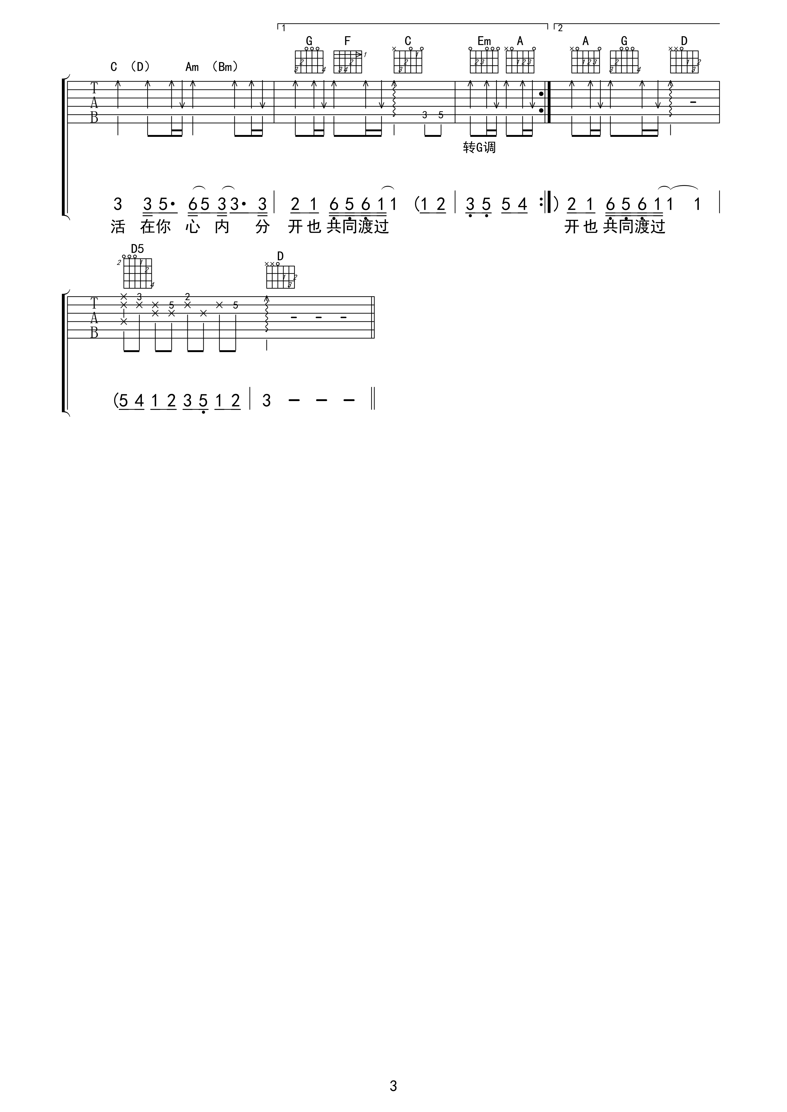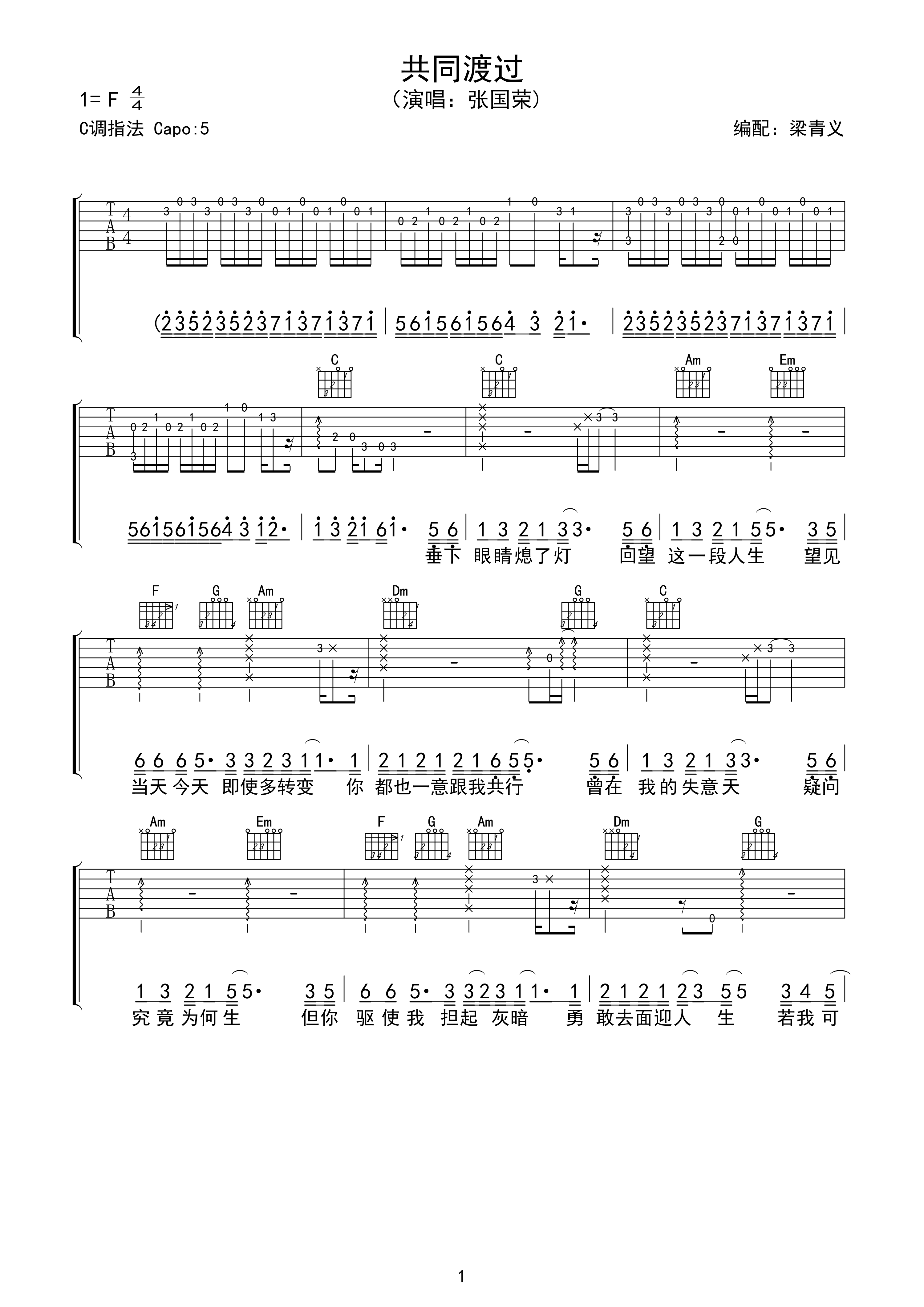 曲谱介绍: 张国荣《共同渡过》吉他弹唱谱,采用C调指法编配,梁青义编配出品,共有3张高清图谱。