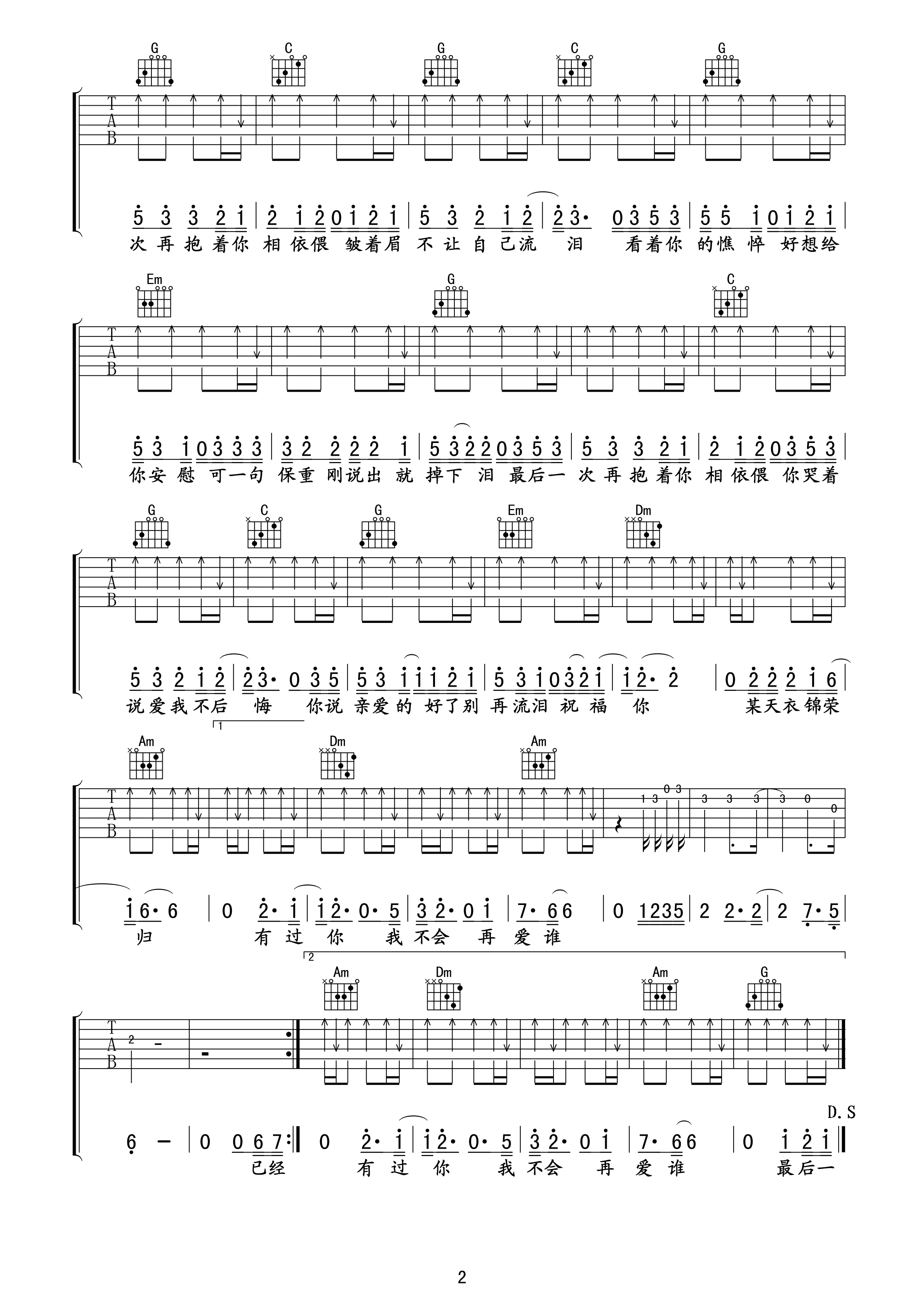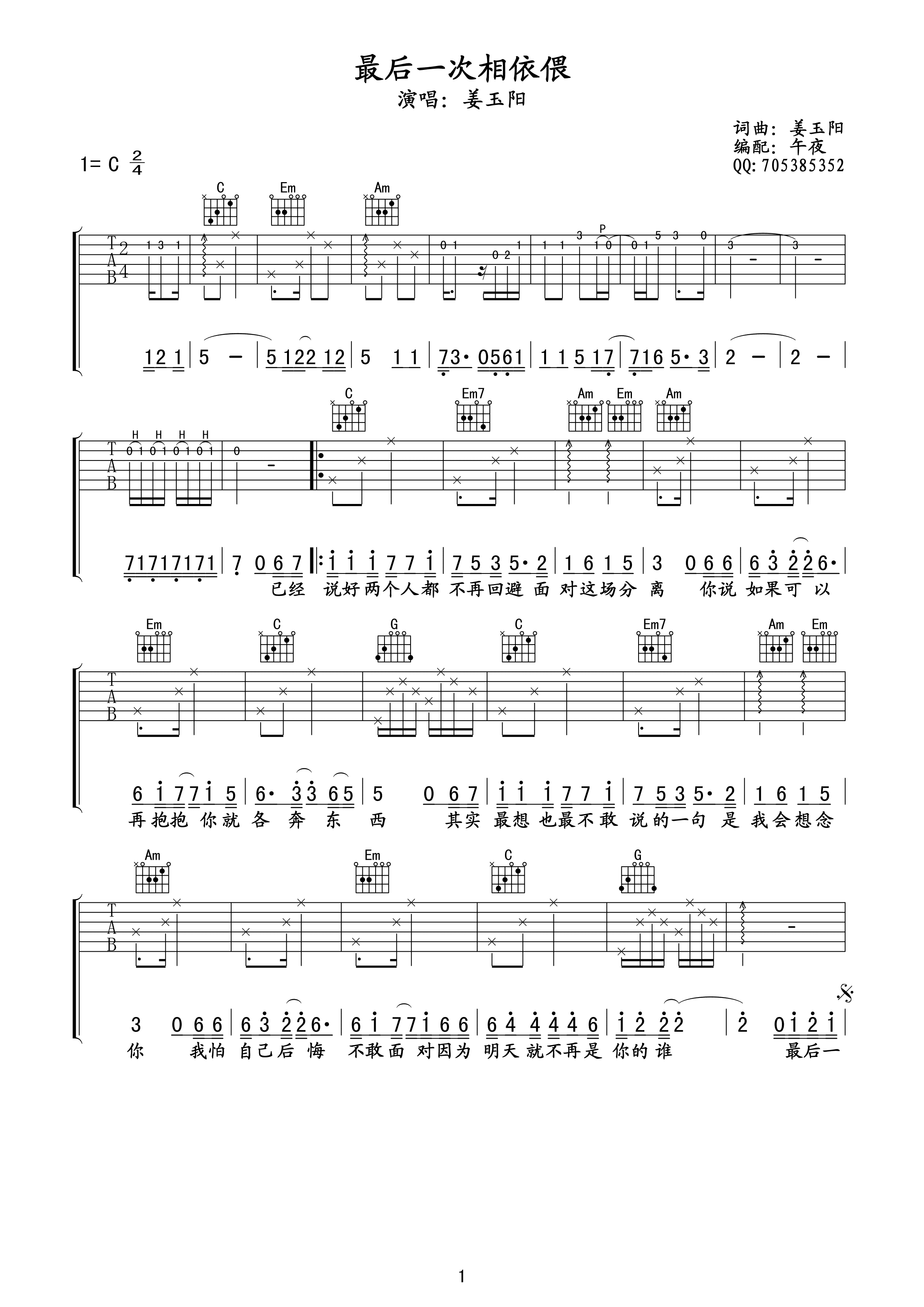 曲谱介绍: 姜玉阳《最后一次相依偎》吉他弹唱谱,采用C调指法编配,午夜编配出品,共有3张高清图谱。